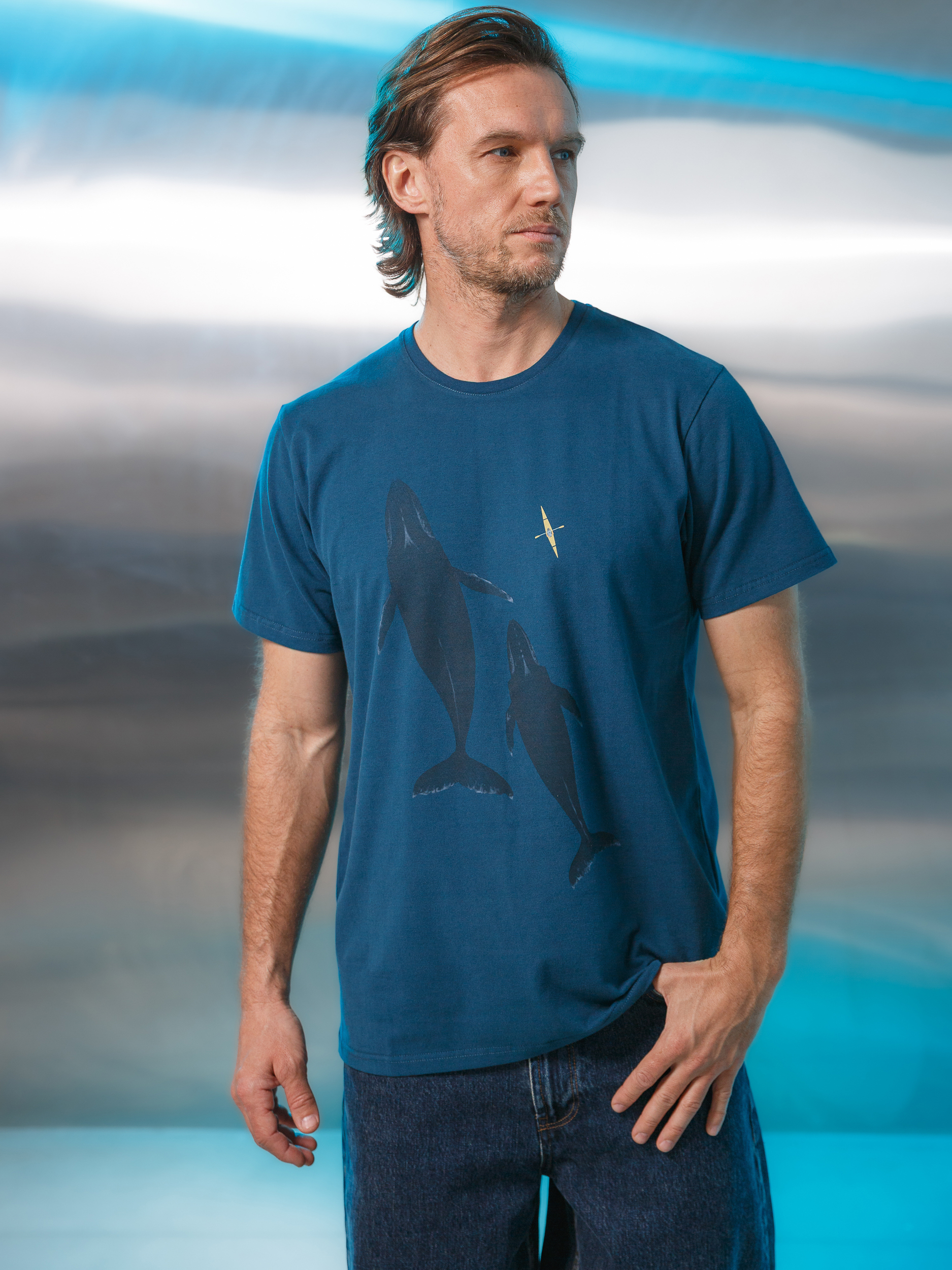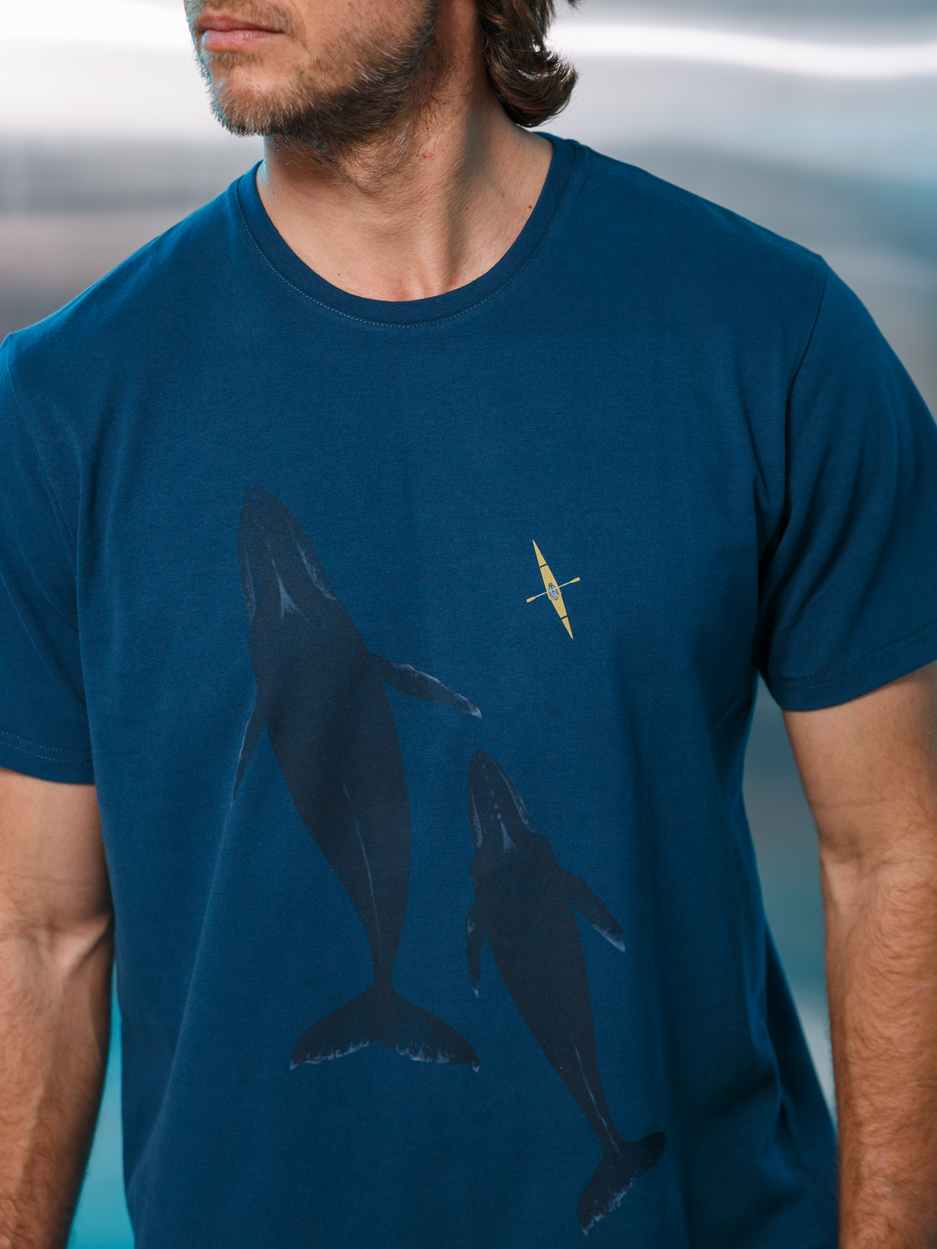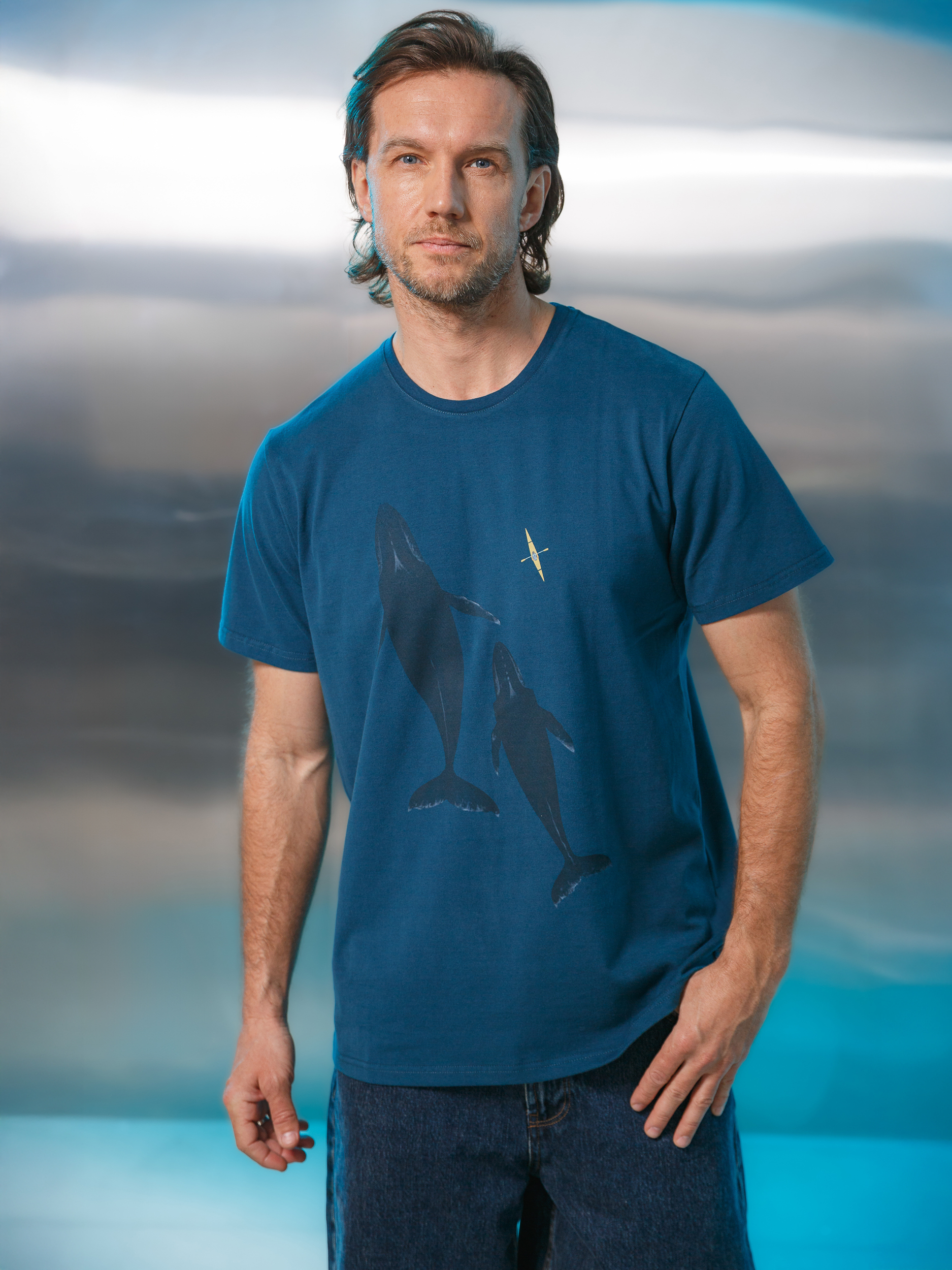 Футболка в классическом крое синего цвета с эффектом велюра. Принт с изображением двух горбатых китов и маленькой лодки каноэ. Принт выполнен в технике шелкографии.