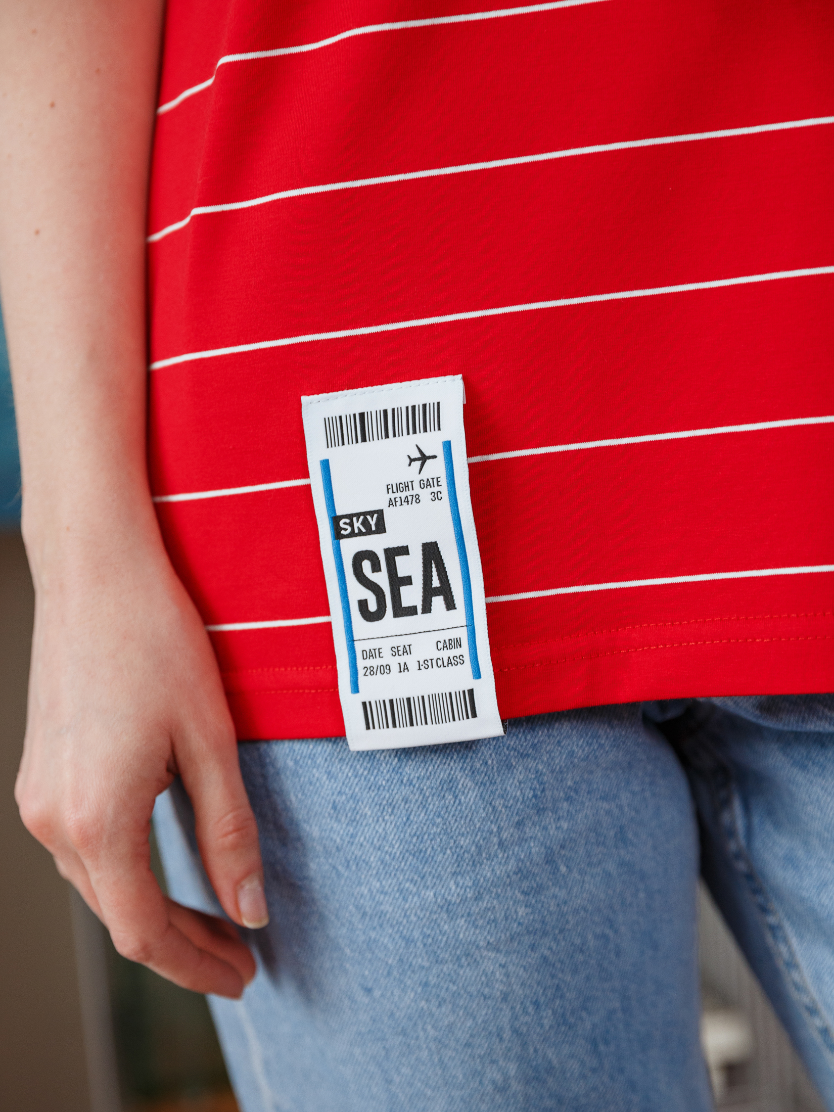 Футболка красного цвета в тонкую белую полоску. На подоле жаккардовый шеврон в виде багажной бирки.