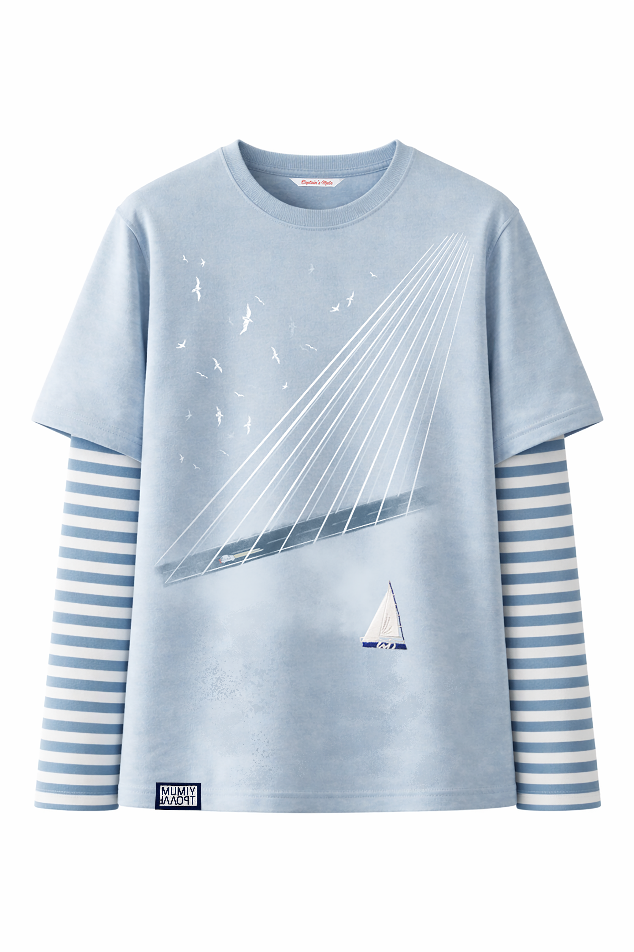 Лонгслив-тельняшка «Морская» - светло-голубого, будто выцветшего от солнца и ветра оттенка, с длинными рукавами в бело-синюю полоску. Лонгсливы мужского и женского кроя. Принт - Русский мост Владивостока, вышивка – яхта "Мумий Тролль". Основное полотно с эффектом варки.