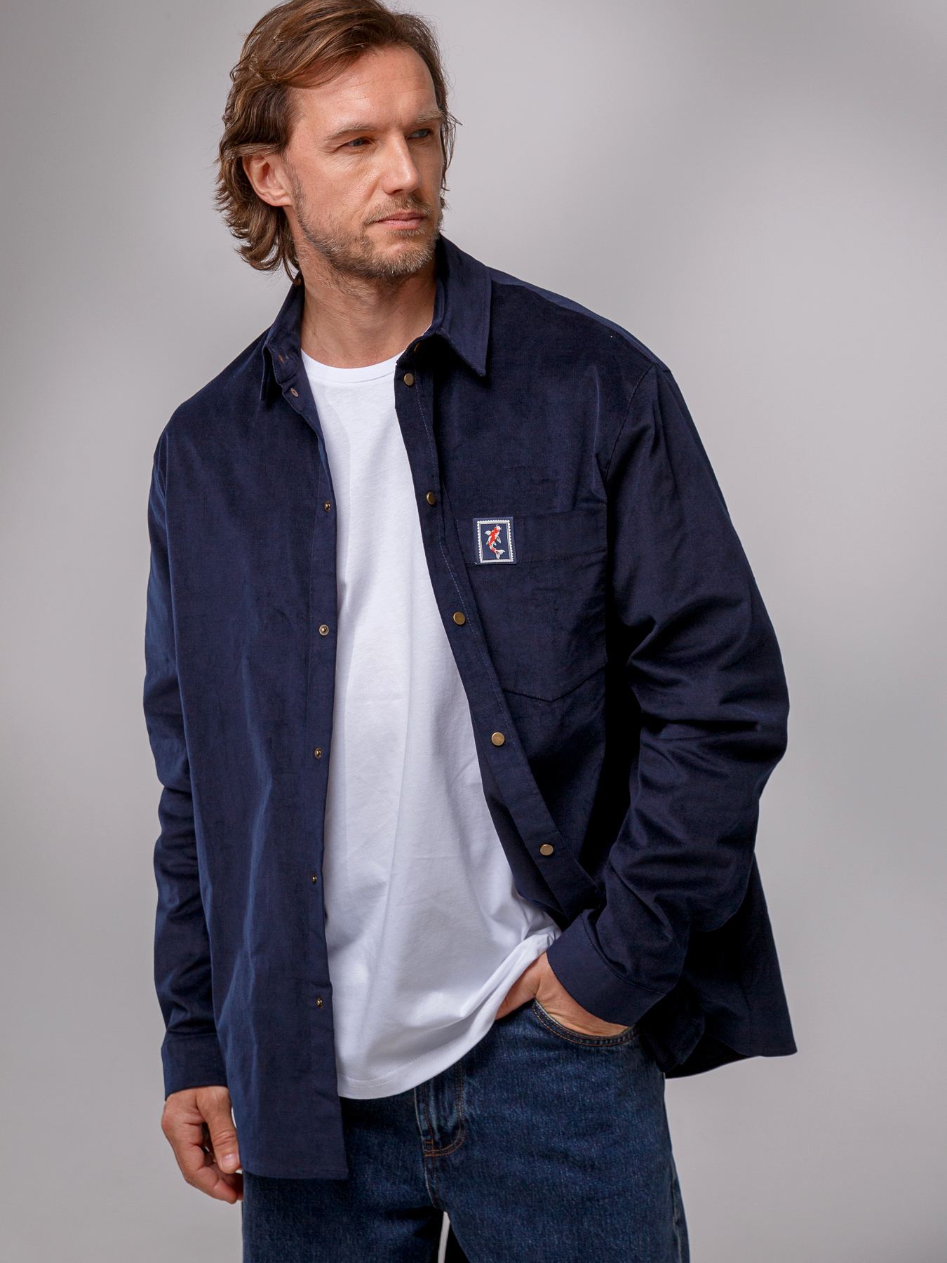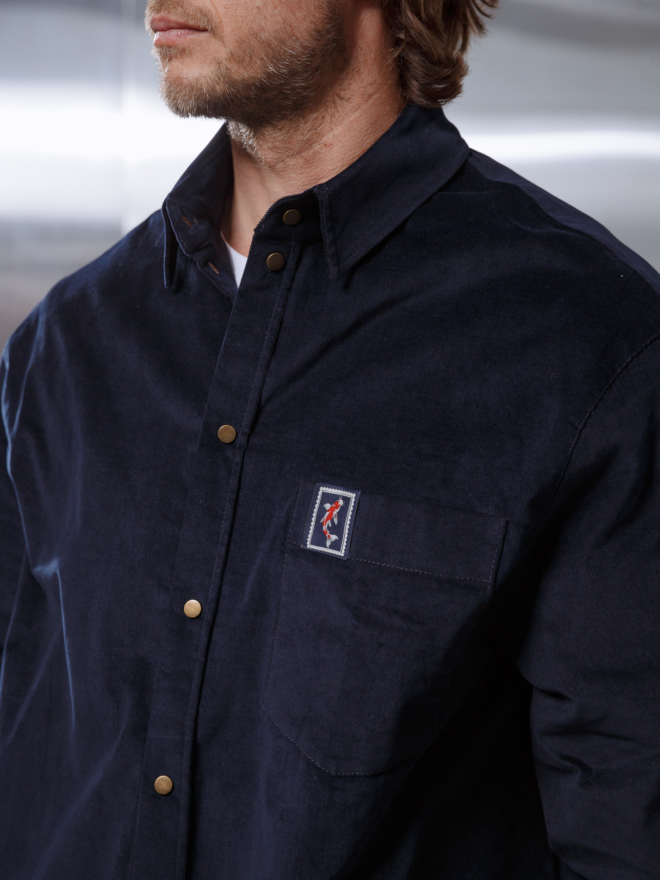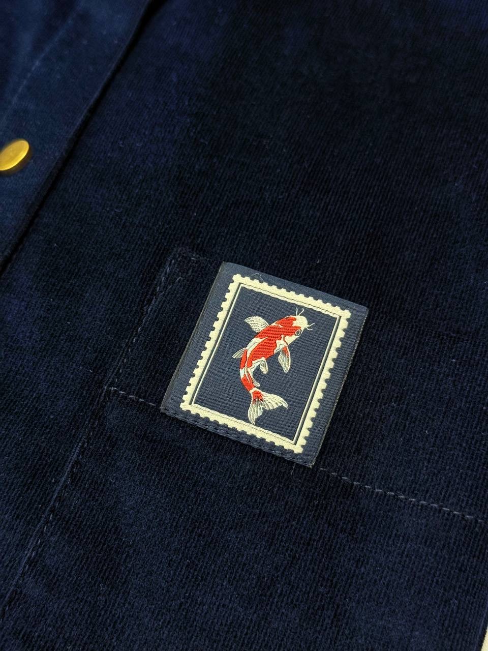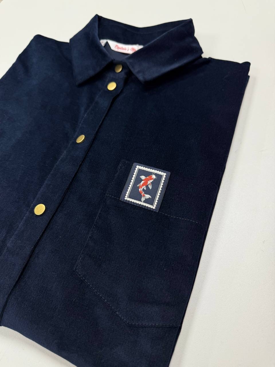 Рубашка из плотного микровельвета темно-синего цвета - оттенка японских морей и вечернего неба. На кармашке - рыбка Кои, символ, приносящий счастье и удачу. Именно этот образ вдохновил нас на рубашку, в которой чувствуешь уверенность и спокойствие. Кнопки бронзового цвета добавляют легкий винтажный акцент.