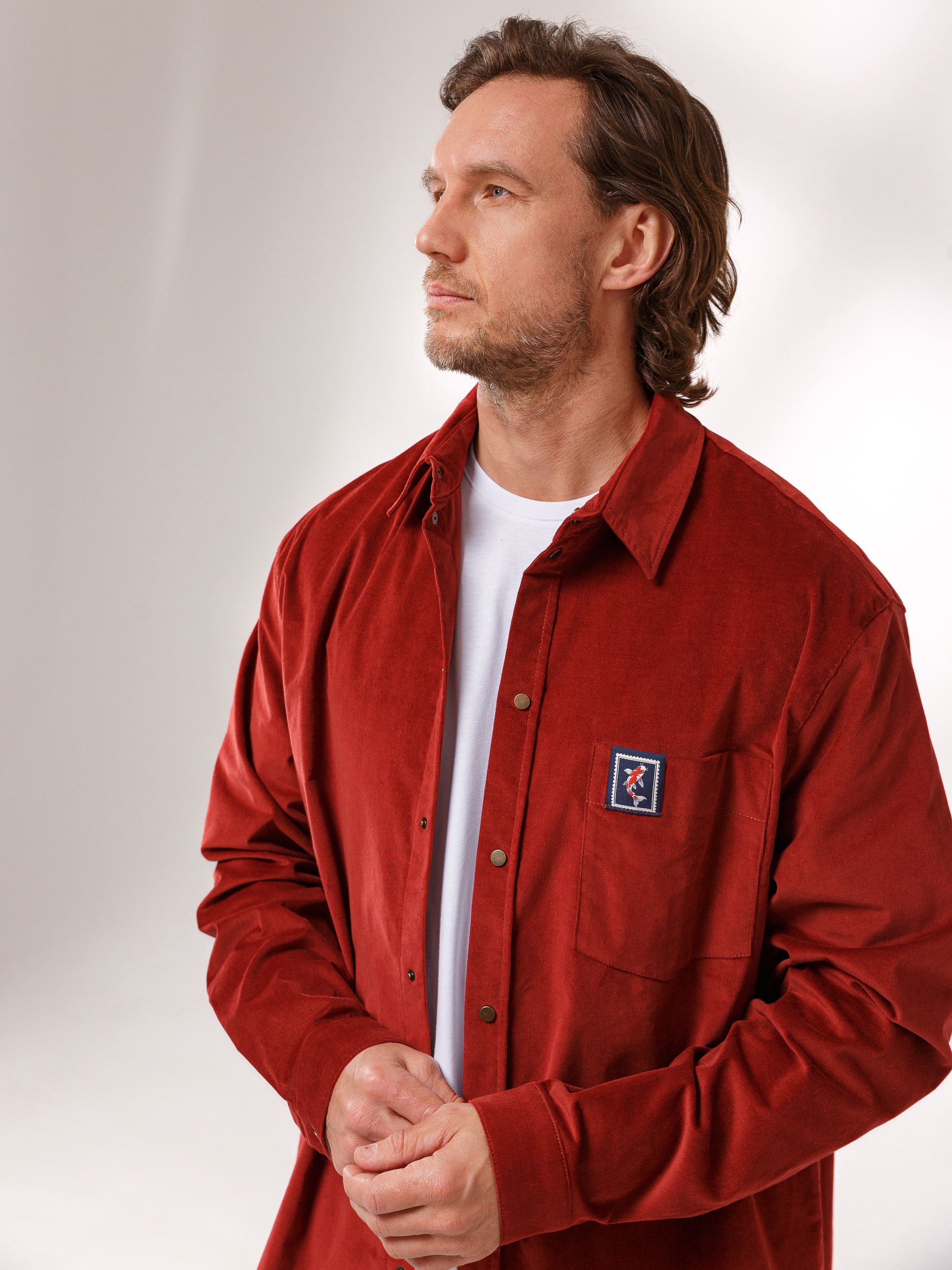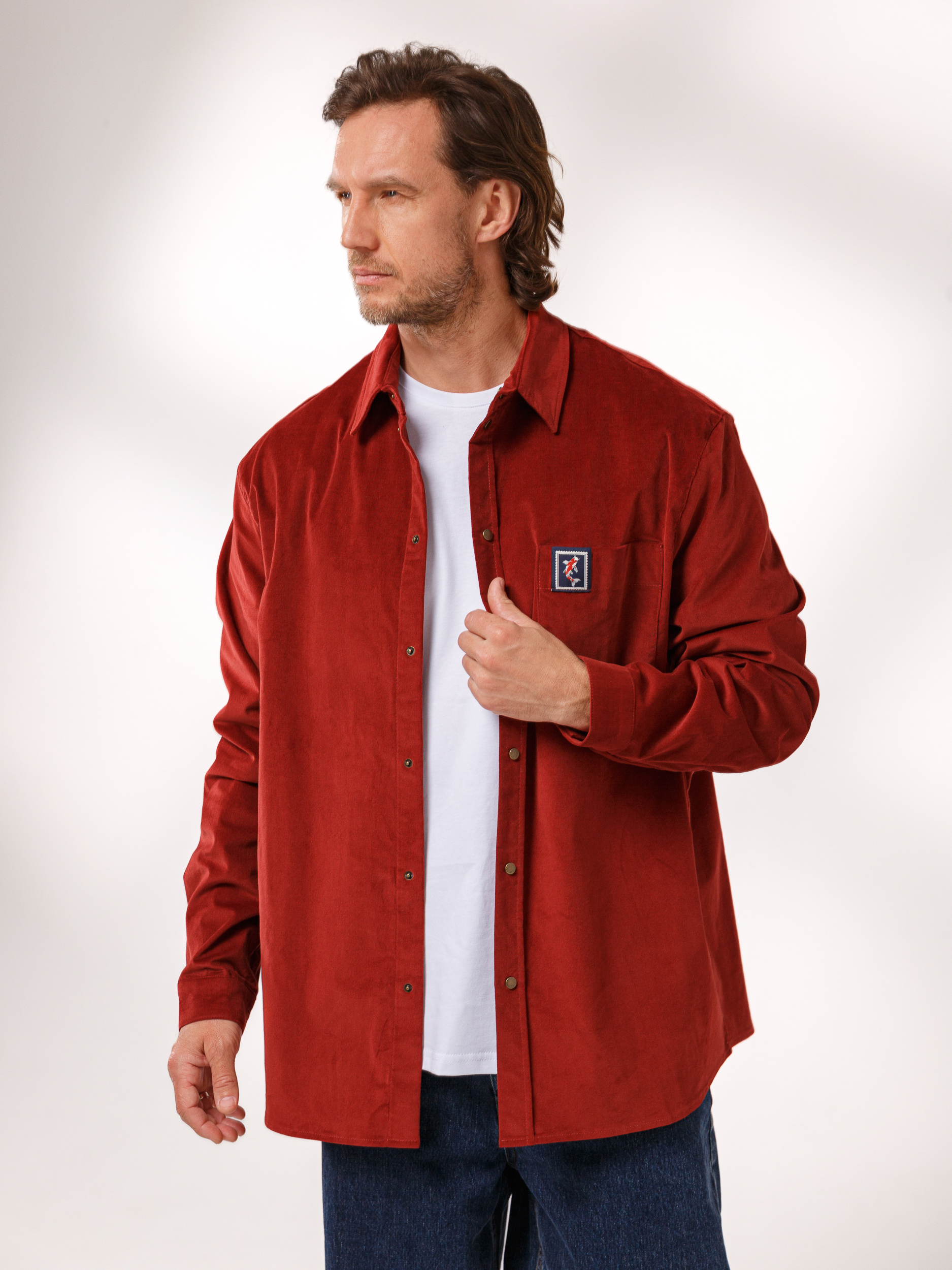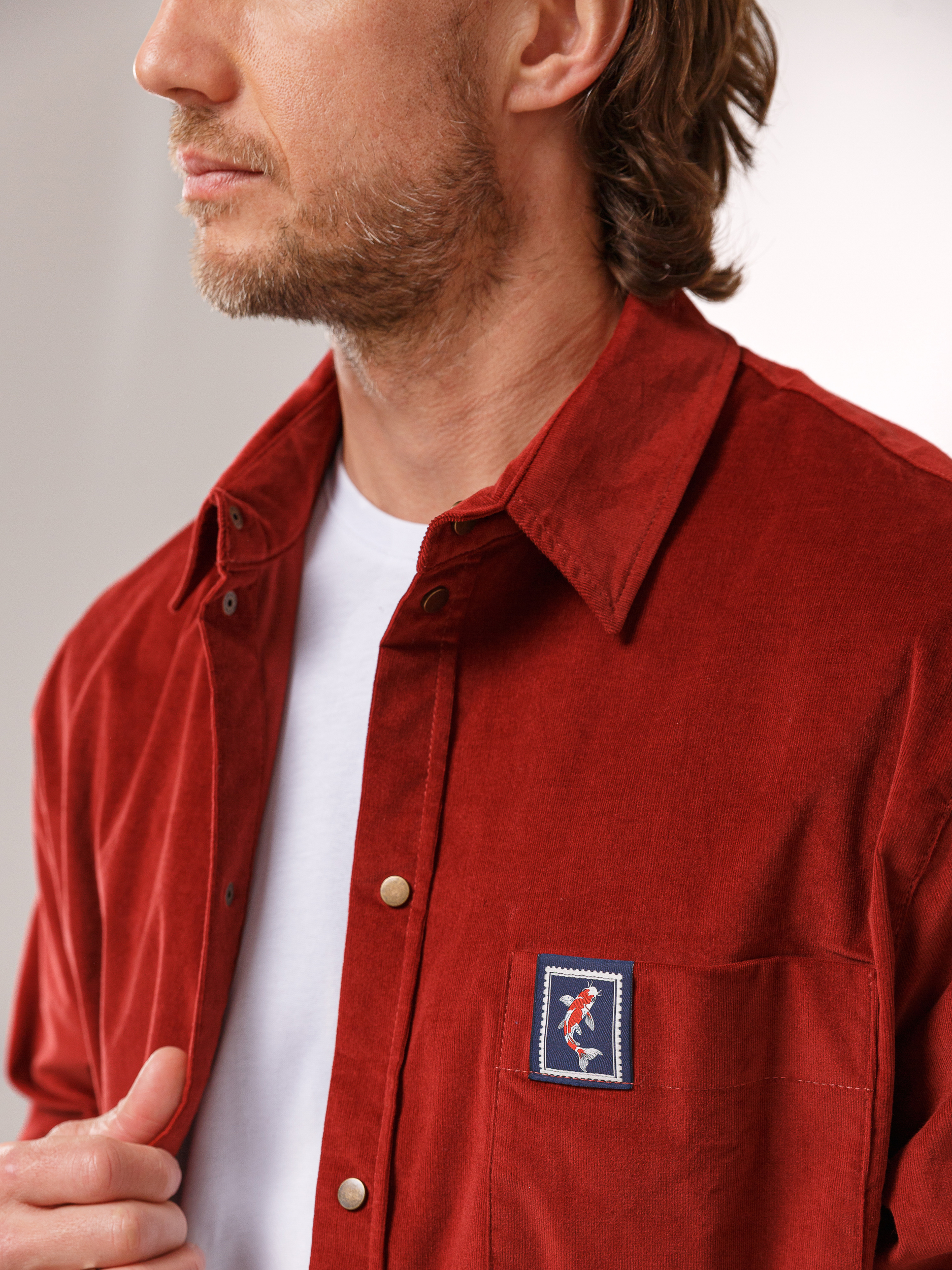Рубашка из плотного микровельвета насыщенного рыжего цвета, словно яркий кленовый лист в японском саду. На кармашке - рыбка Кои, символ, приносящий счастье и удачу.