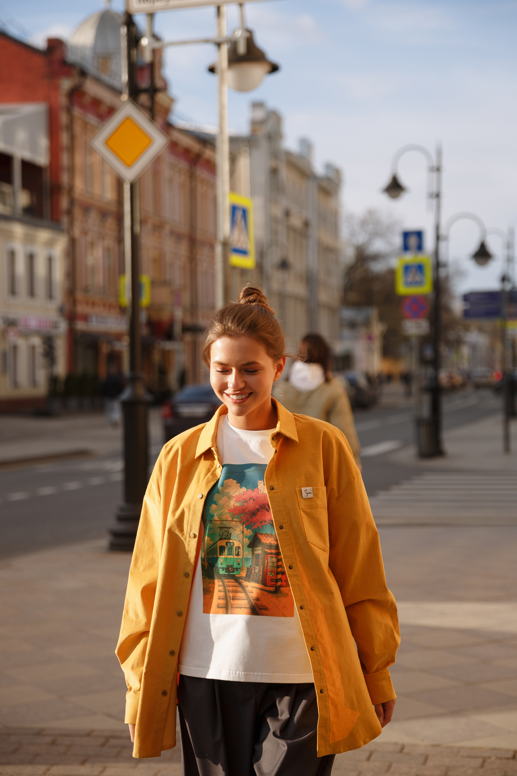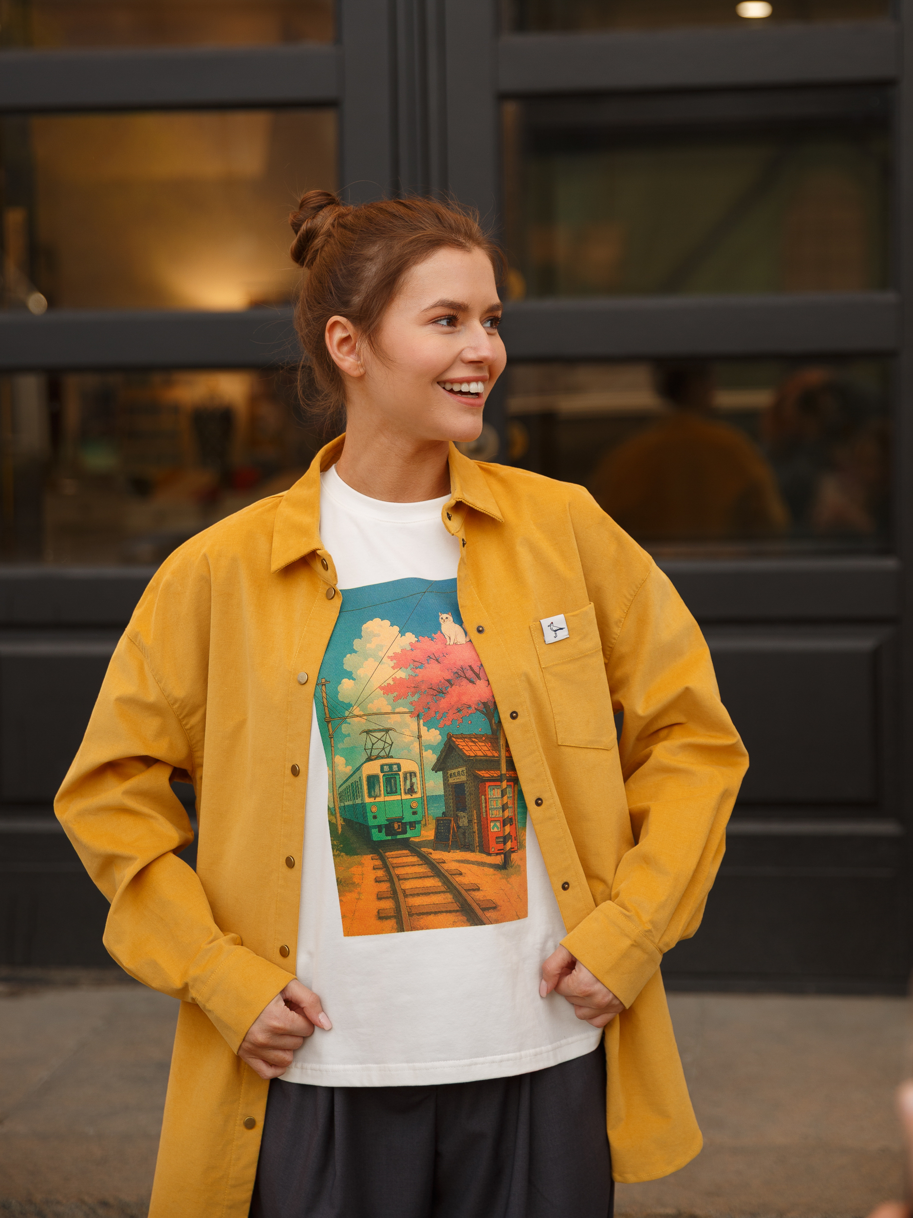 Рубашка из плотного микровельвета насыщенного горчичного цвета.