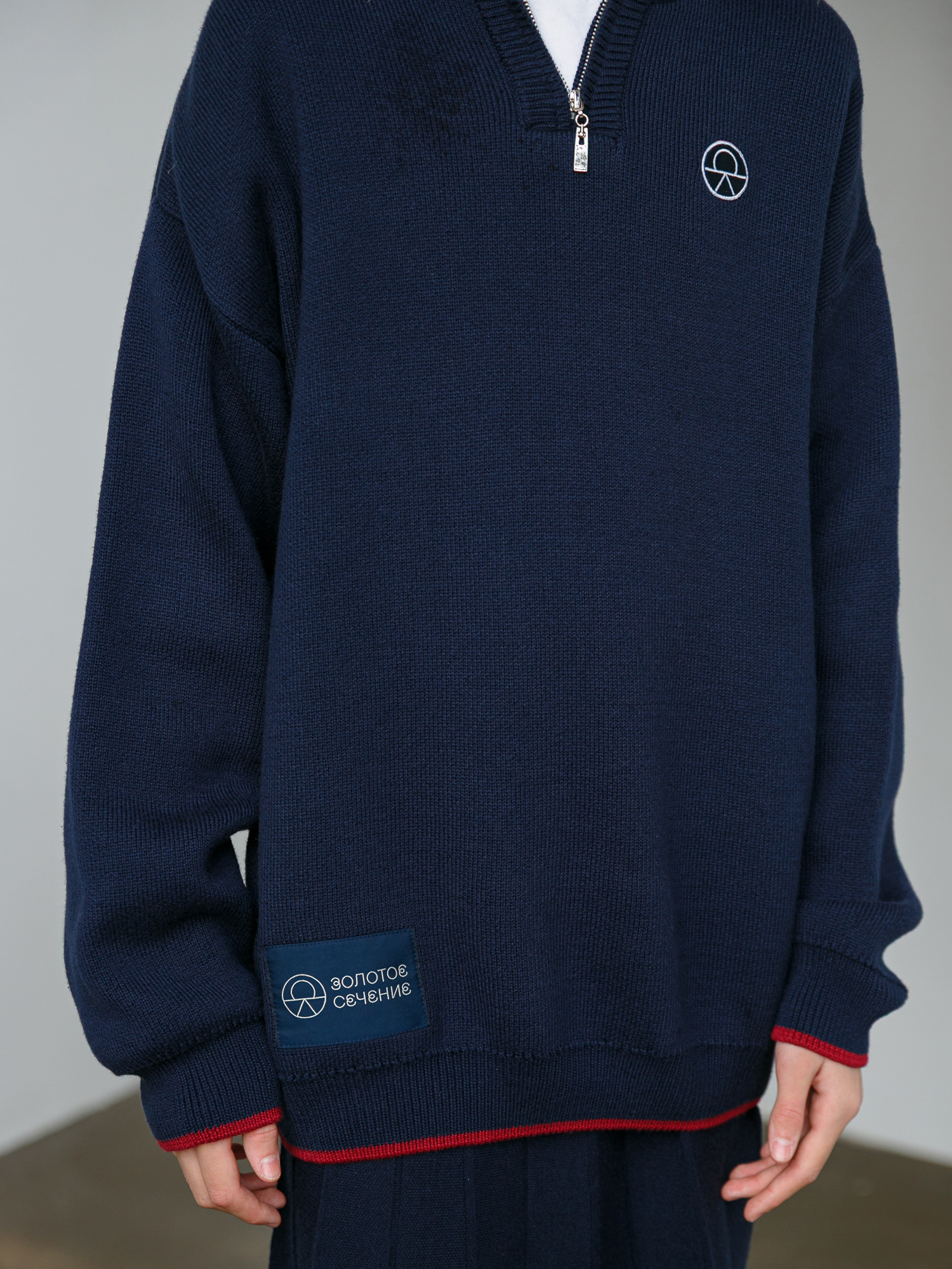 На груди круглый шеврон с логотипом школы, внизу крупная жаккардовая этикетка "Золотое сечение".