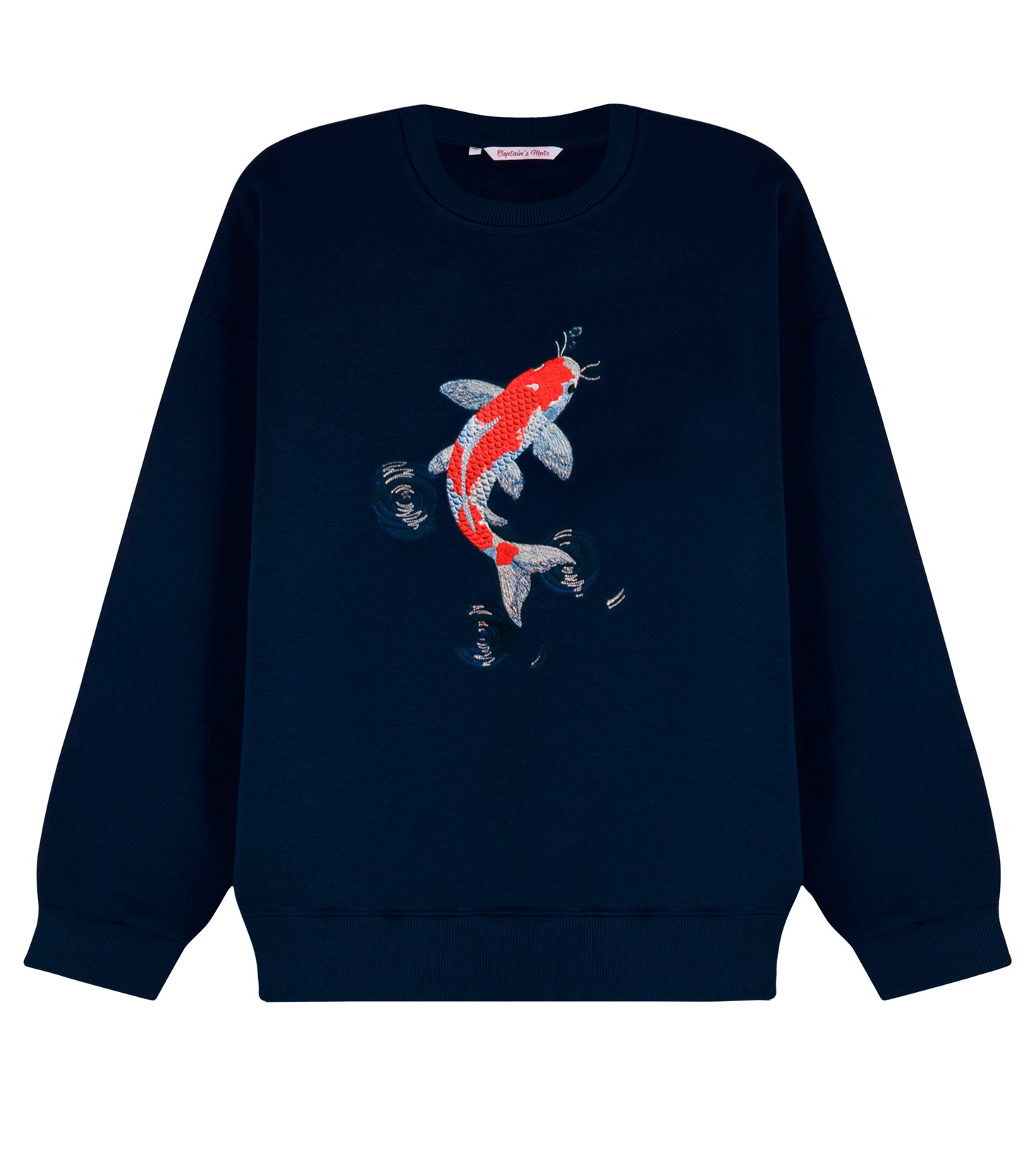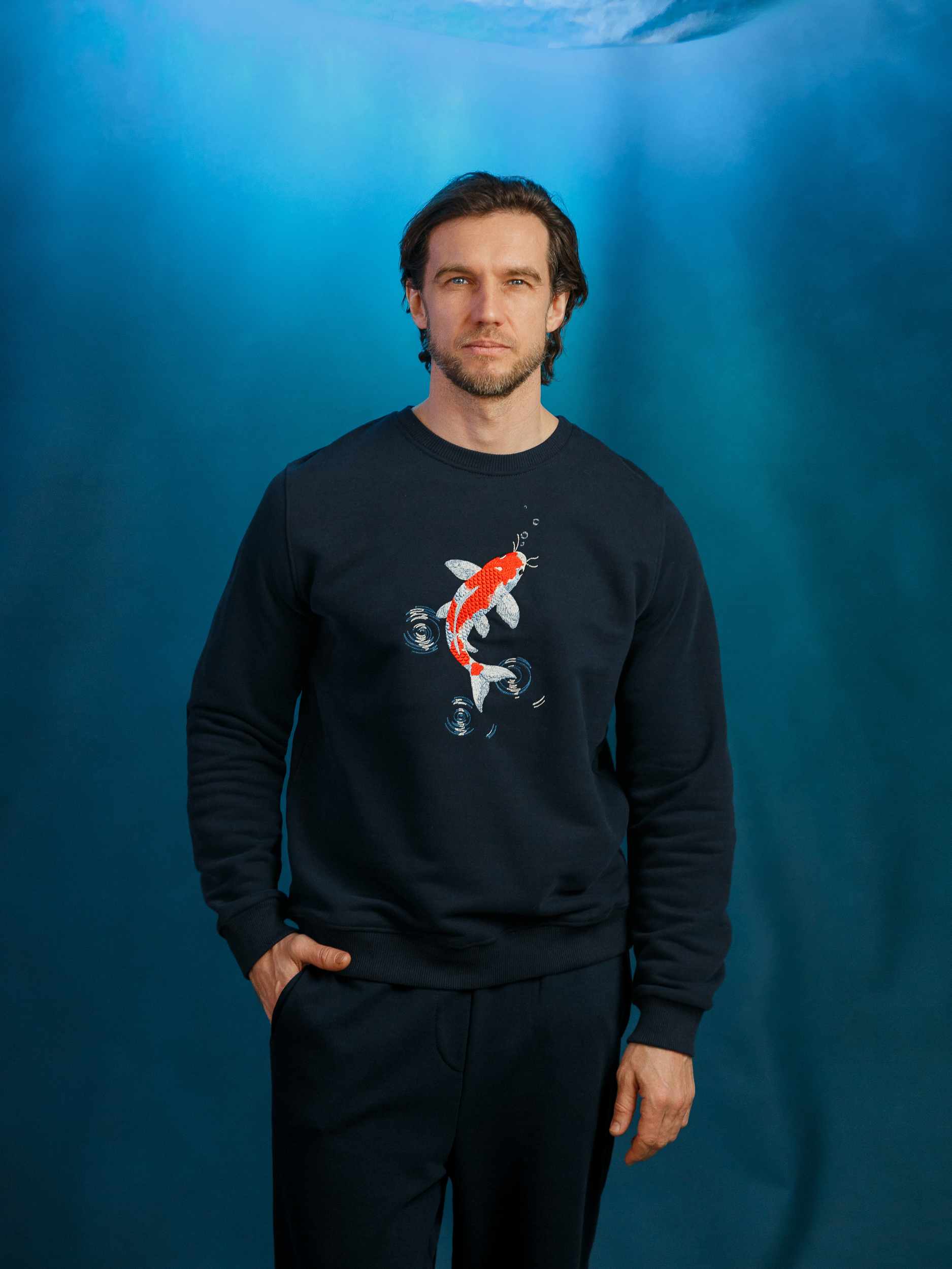 Так появился наш свитшот Koi Fish глубокого синего оттенка, с вышивкой, переливающейся при свете, и уютом, который всегда рядом.
