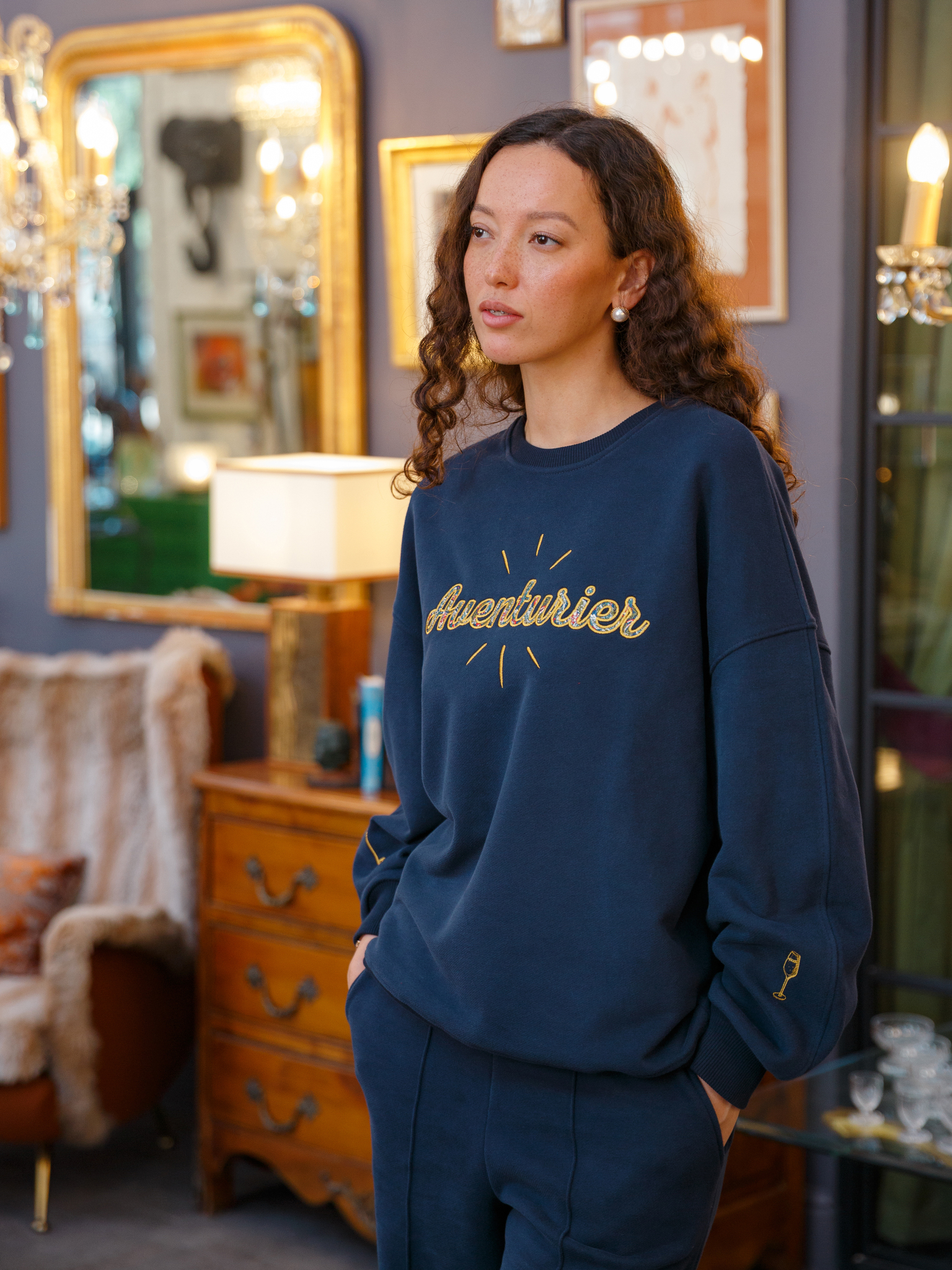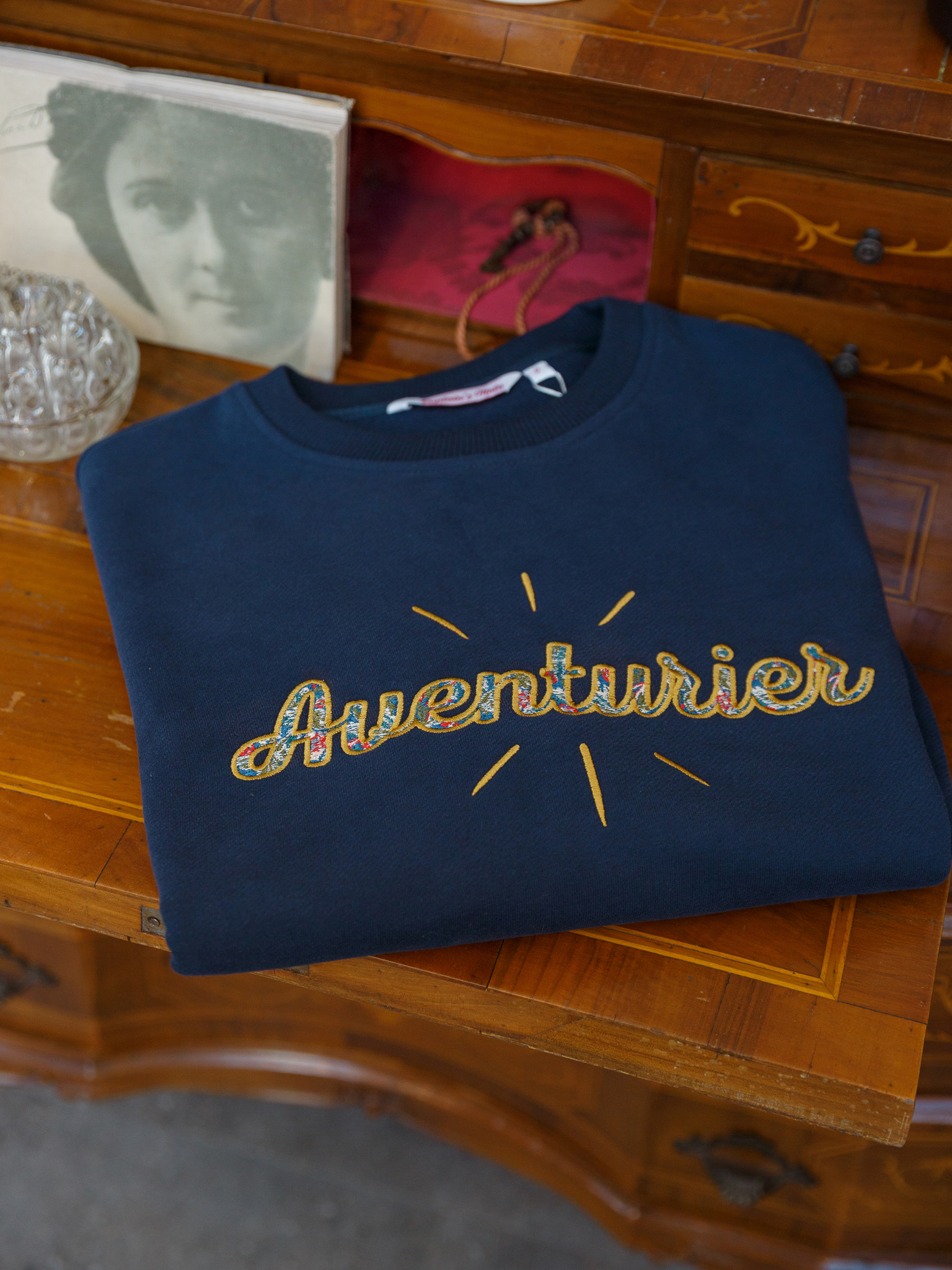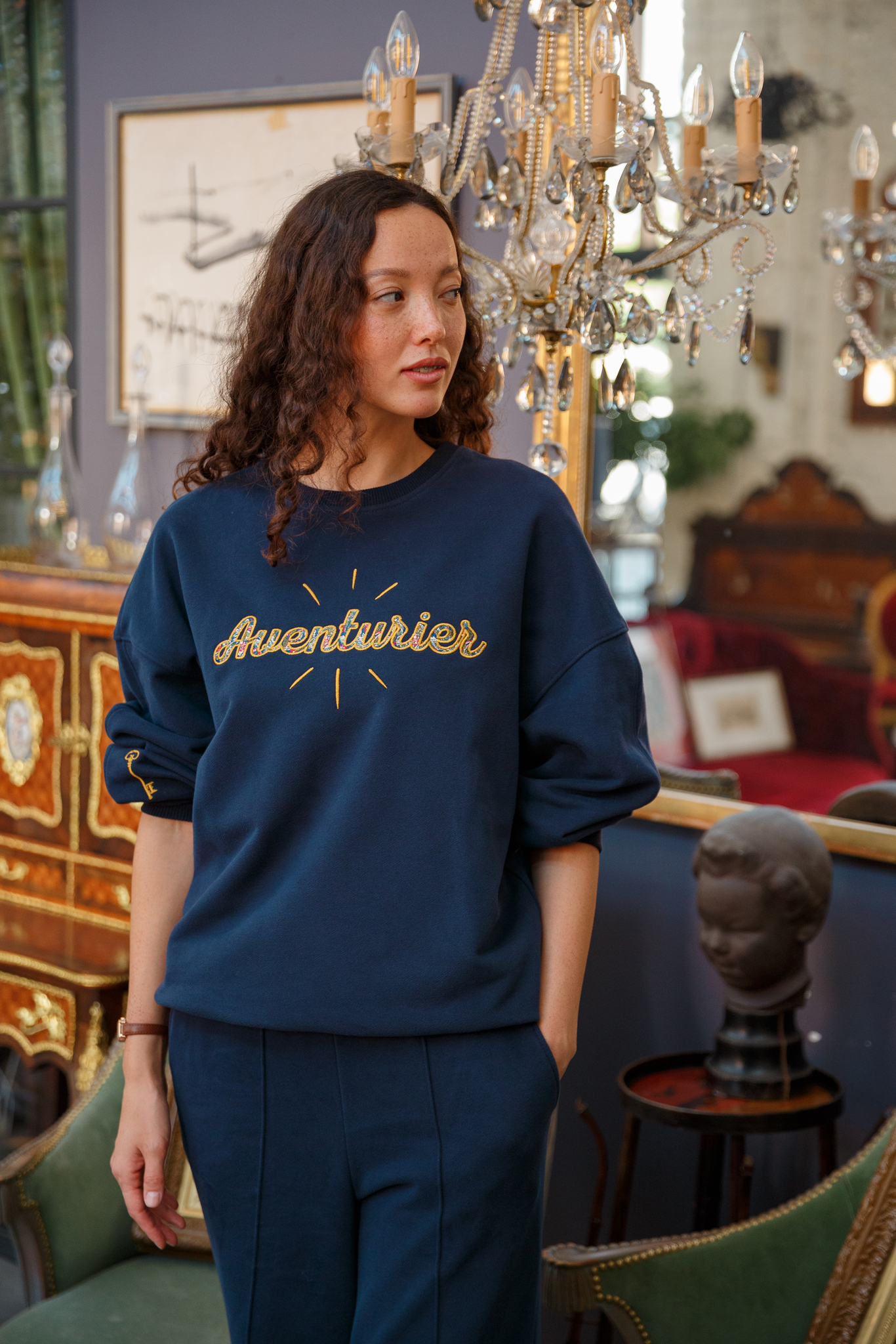 Глубокий темно-синий цвет, мягкий силуэт и вышивка на груди с надписью Avanturier («Авантюрист»), имитирующая жаккардовую обивку старинного дивана. Лучи, исходящие от надписи, отсылают к логотипу галереи, как свечение от старинных предметов с историей и собственной душой.