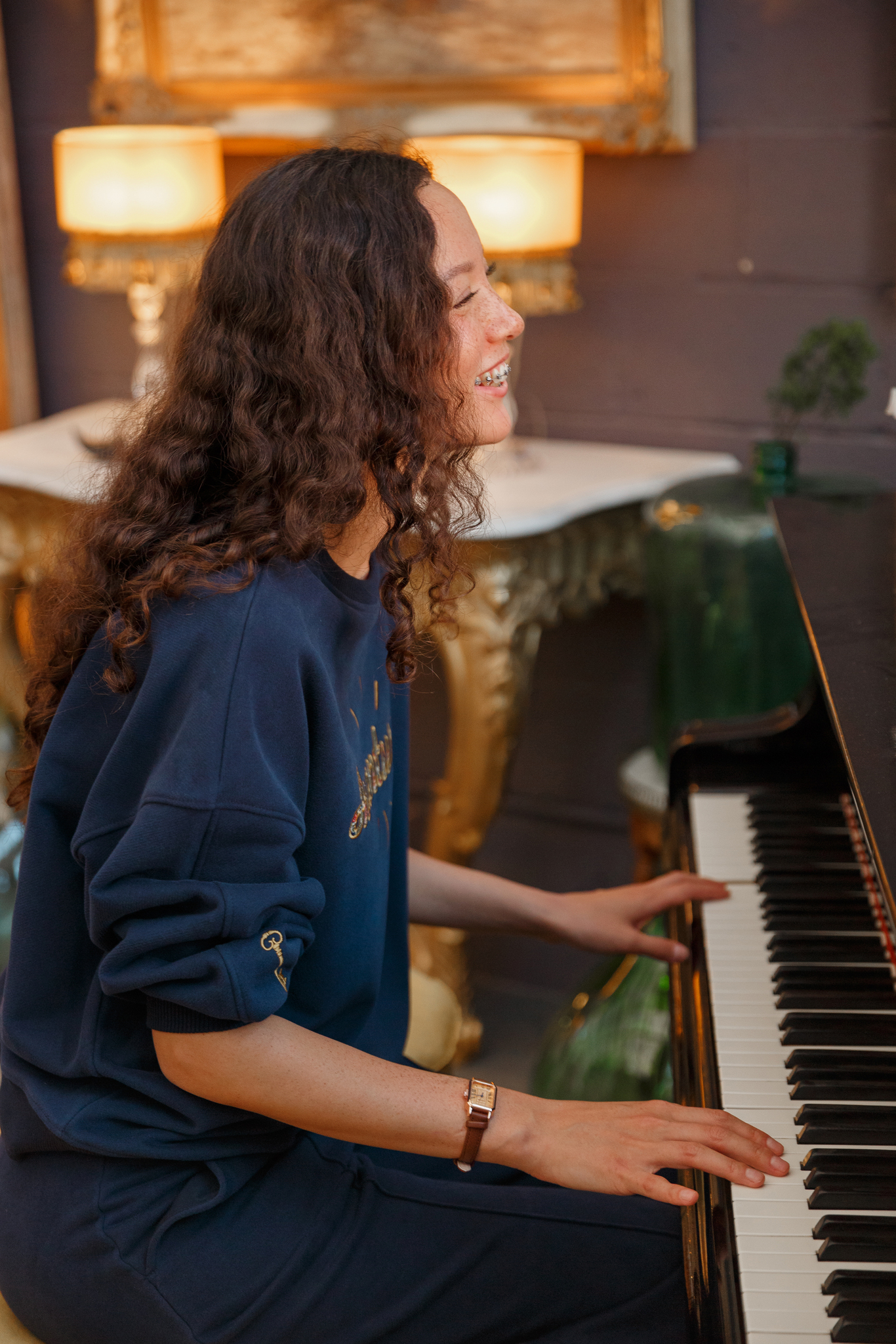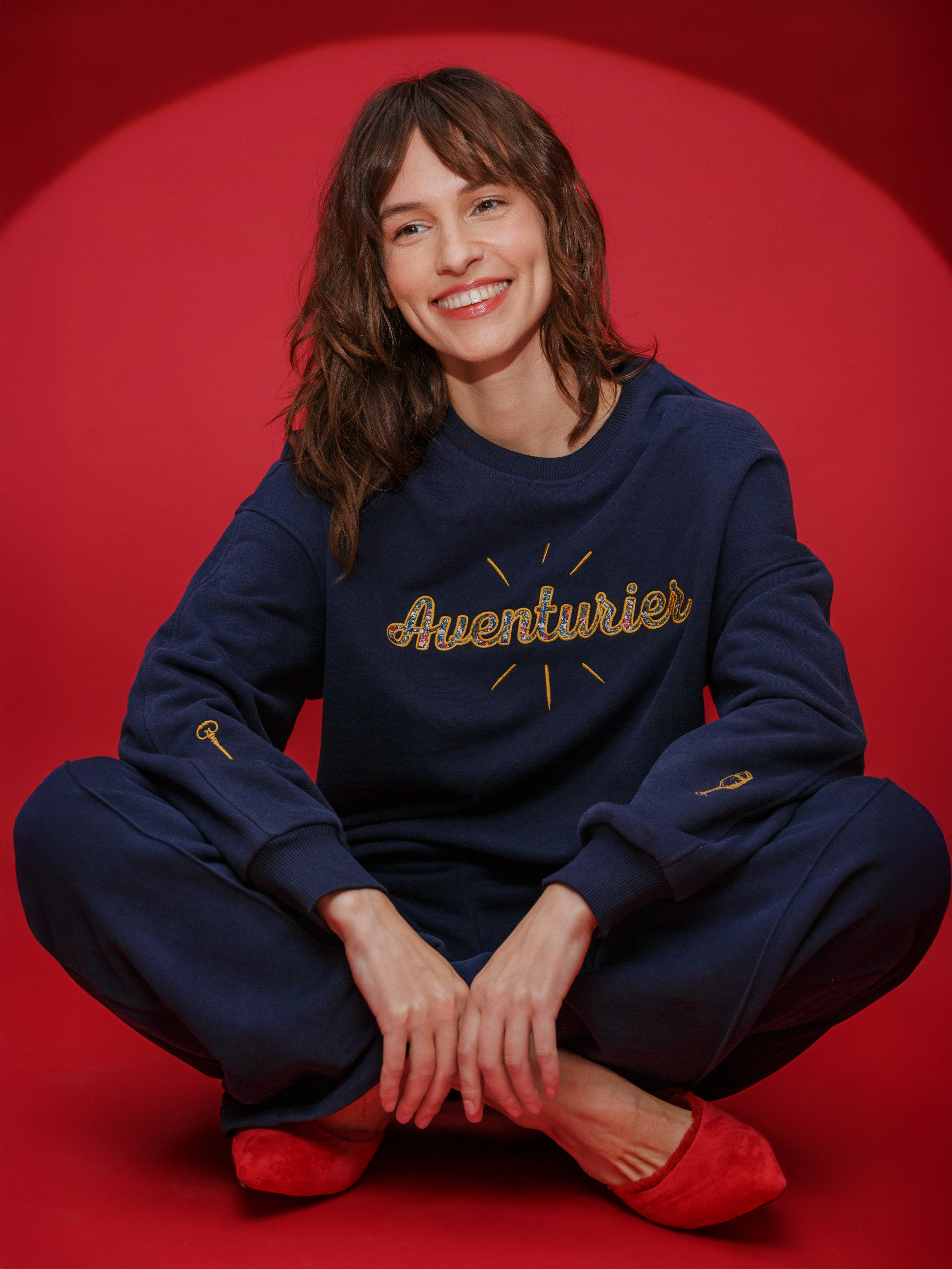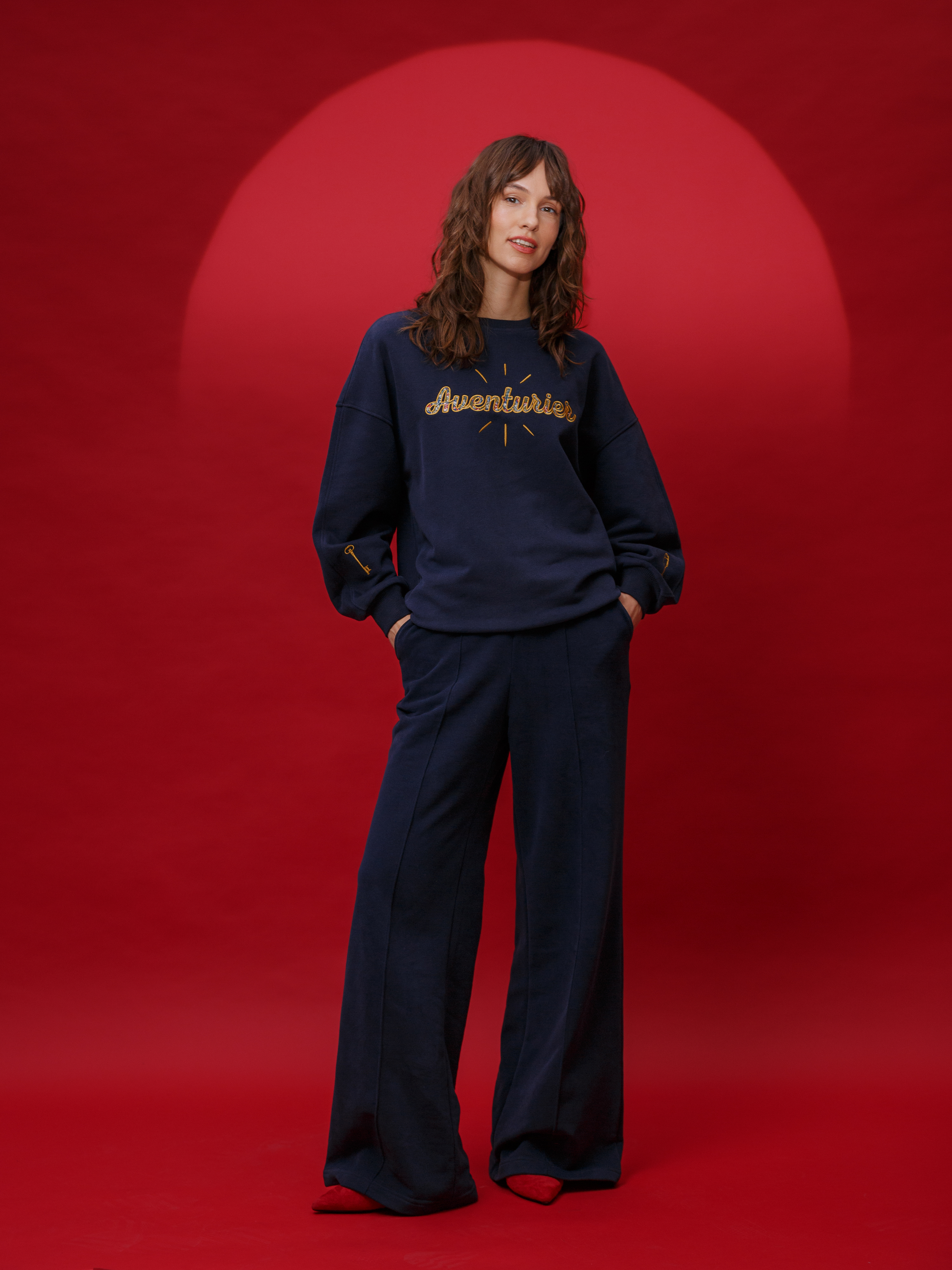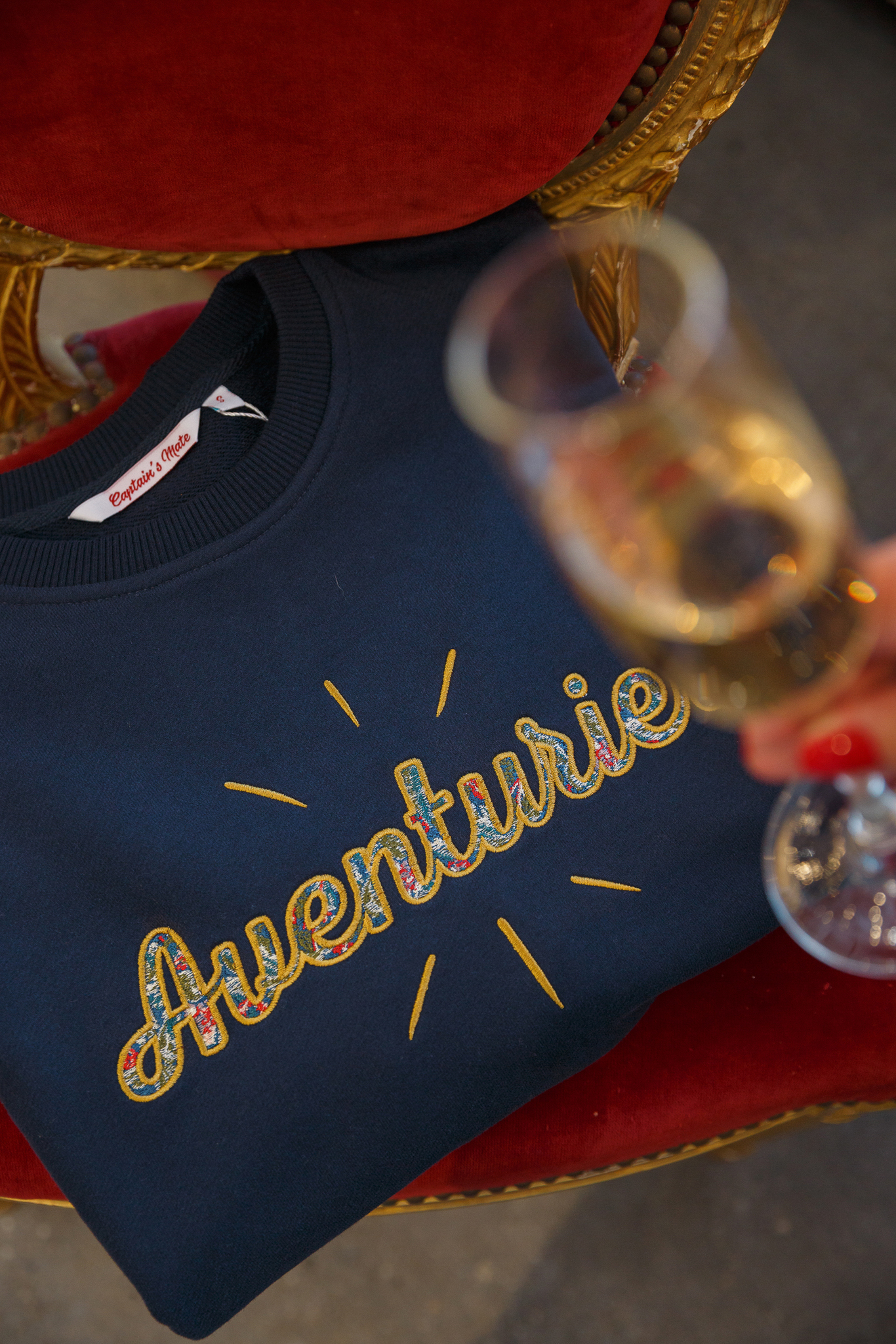 Глубокий темно-синий цвет, мягкий силуэт и вышивка на груди с надписью Avanturier («Авантюрист»), имитирующая жаккардовую обивку старинного дивана. Лучи, исходящие от надписи, отсылают к логотипу галереи, как свечение от старинных предметов с историей и собственной душой.