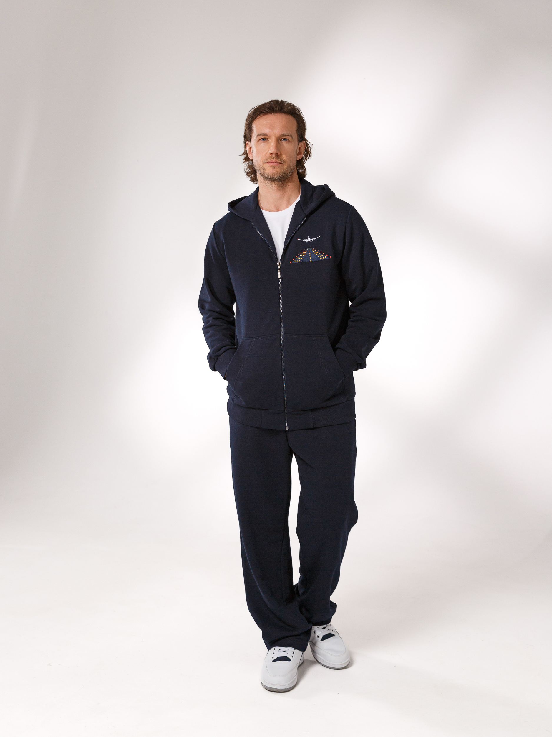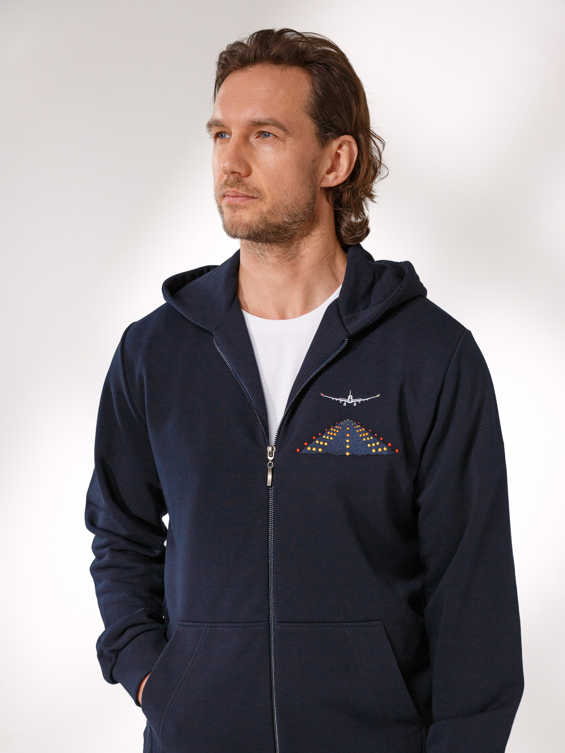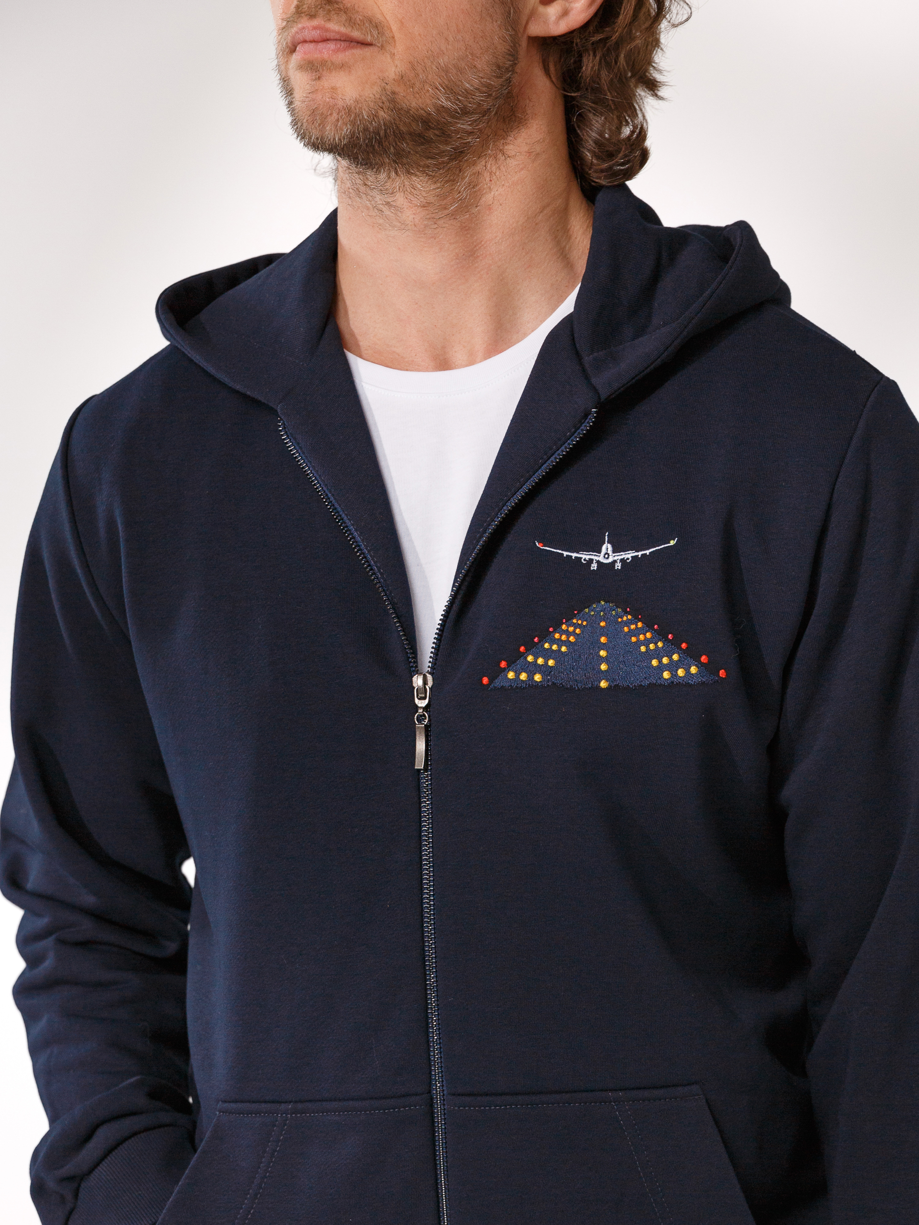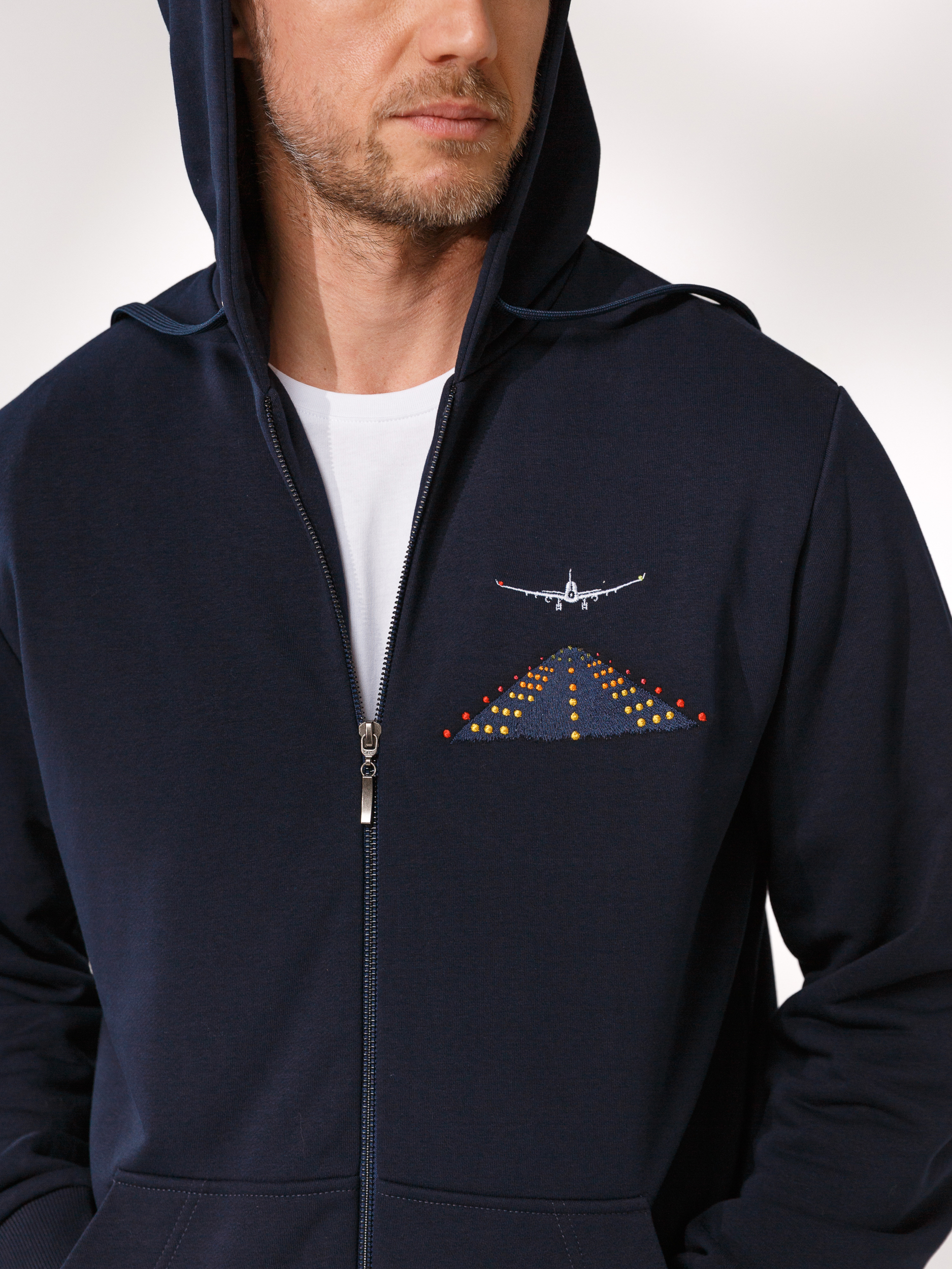 Вышивка на груди в виде горящих огней взлётной полосы и самолёта.