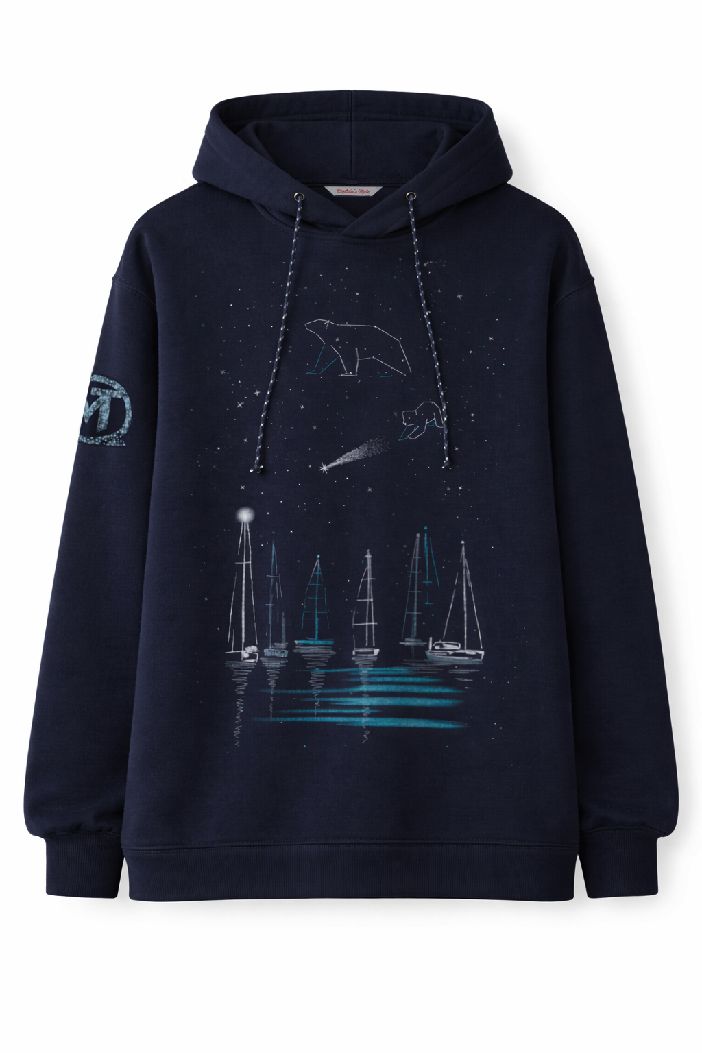 Уютная худи «Amore Море» - темно-синего цвета. Здесь яхты спят под звездным небом. Худи объемного кроя, унисекс, отлично подходит как мужчинам, так и женщинам. Сшита из невероятно мягкого бархатистого полотна с эффектом велюра, имеет объемные боковые карманы и капюшон со шнурами в яхтенном стиле. Тут никогда не угадаешь: то ли Большая, то ли Малая...