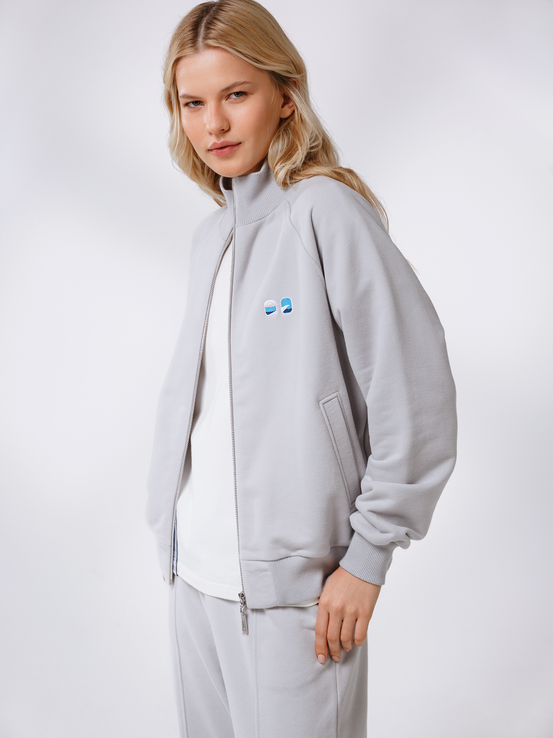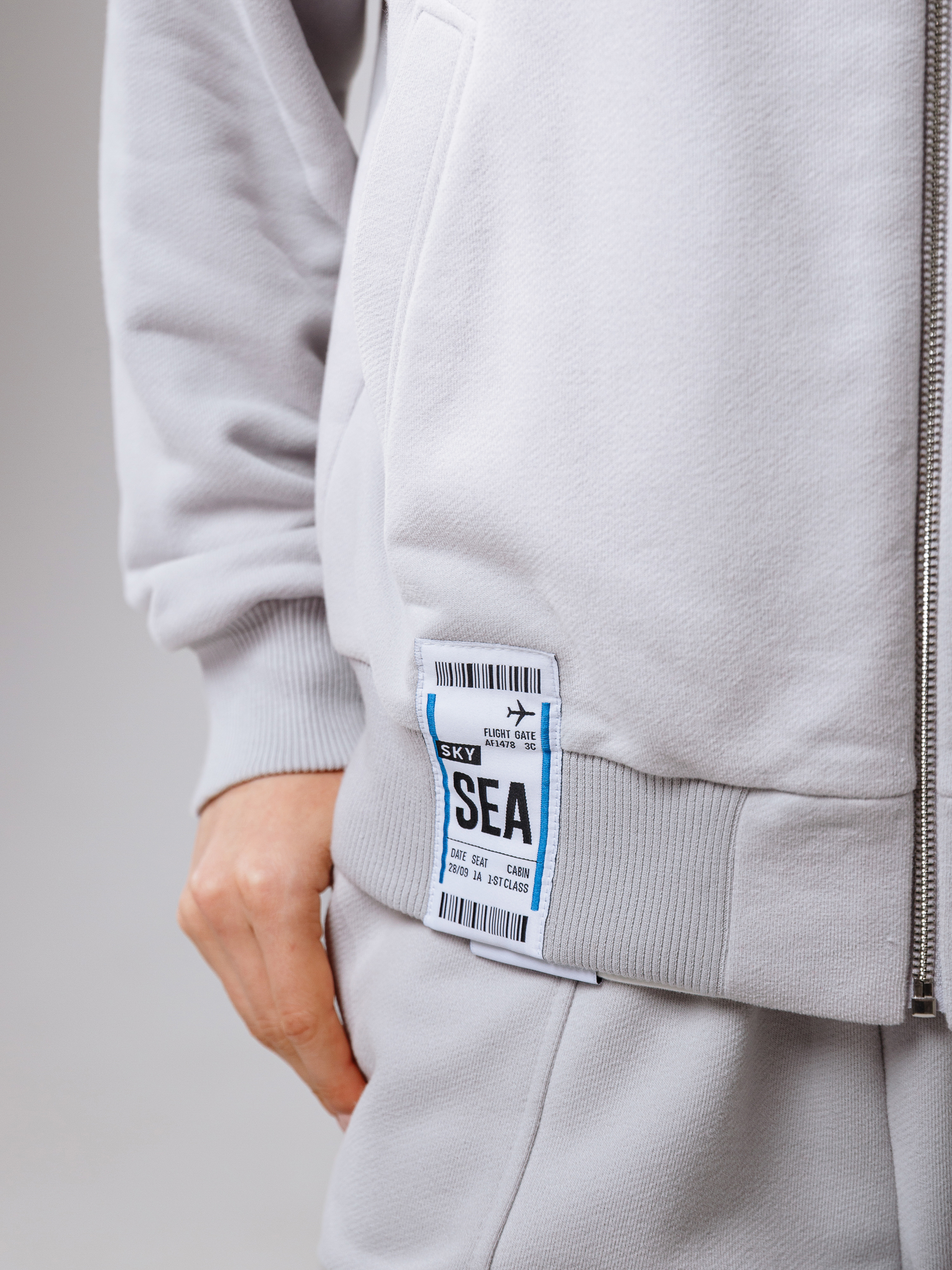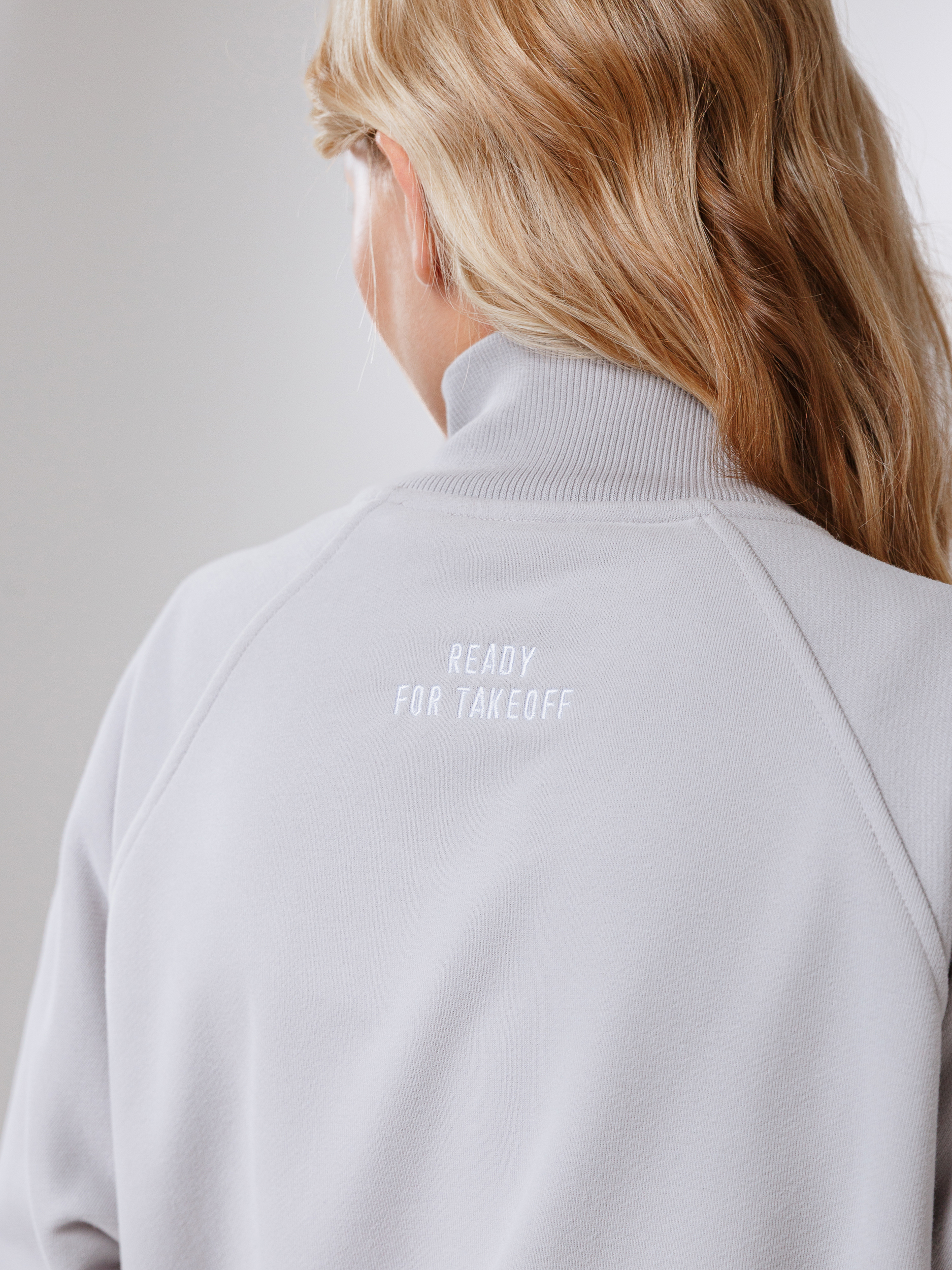 Женская толстовка серого цвета на молнии, выполненная из футера с эффектом велюра. Объёмный крой с рукавом реглан. На груди вышивка в виде иллюминаторов, большой жаккардовый шеврон в виде багажной бирки, а на спинке вышивка с надписью "Ready for takeoff" (Готов к взлёту).