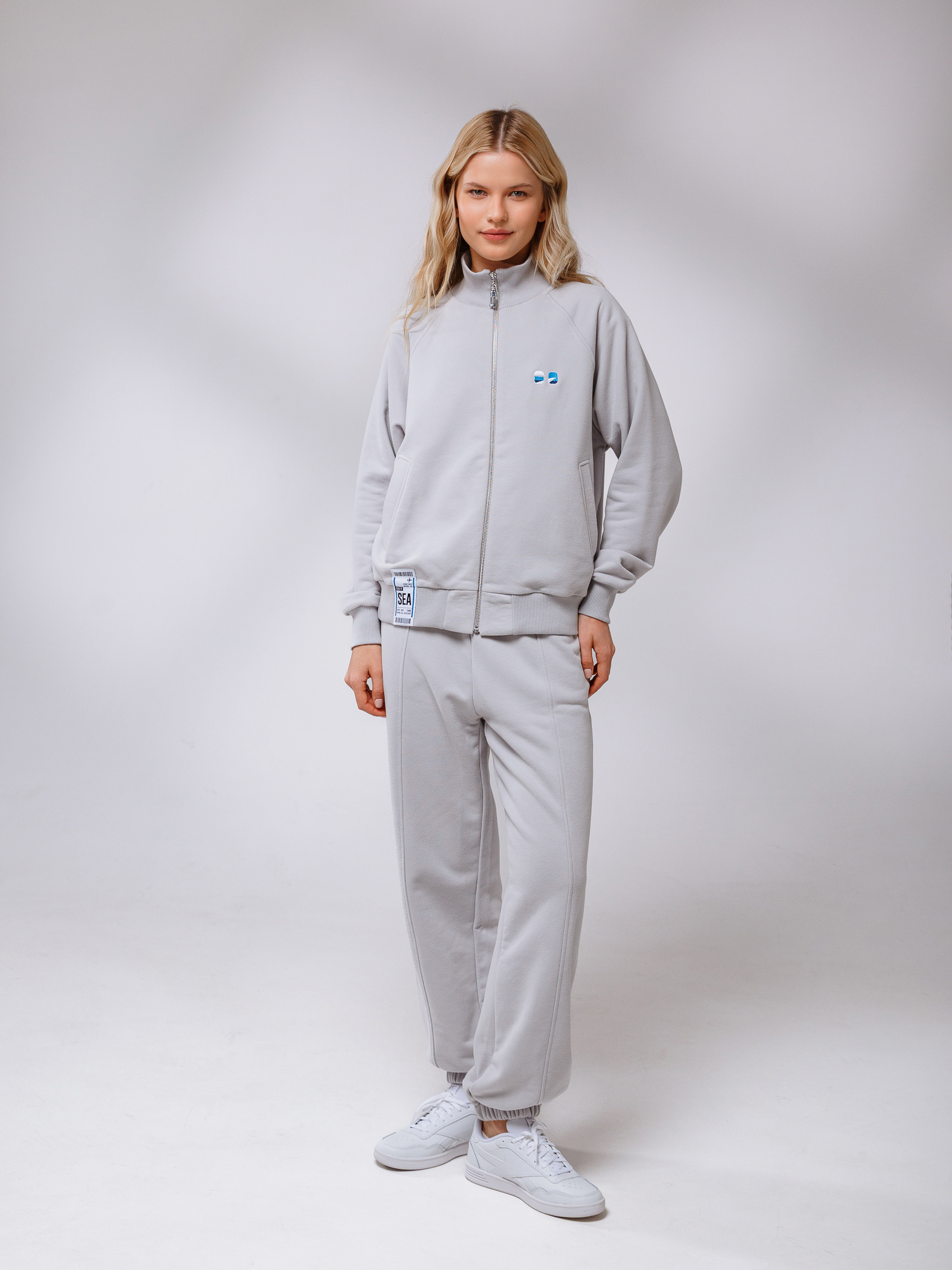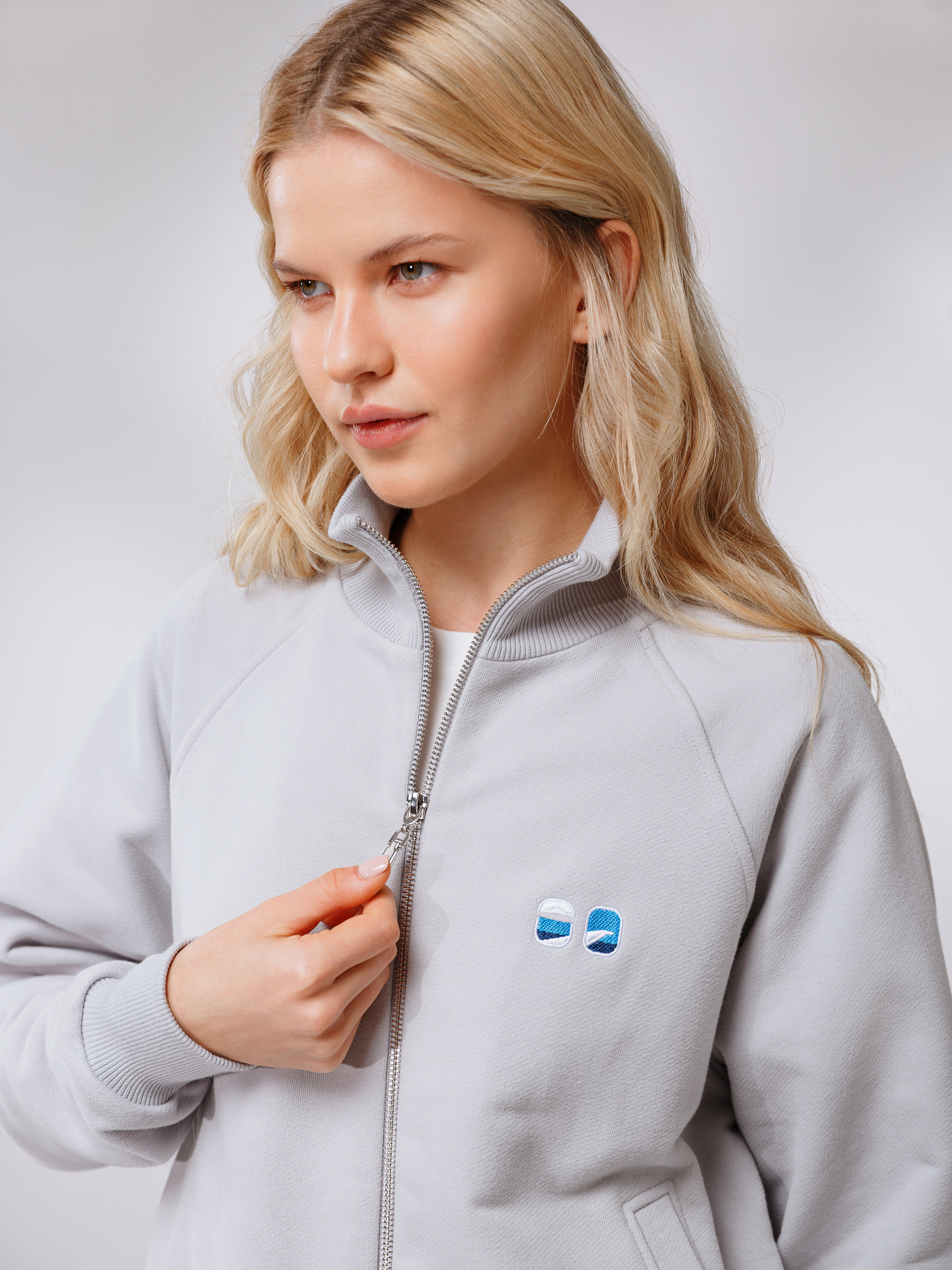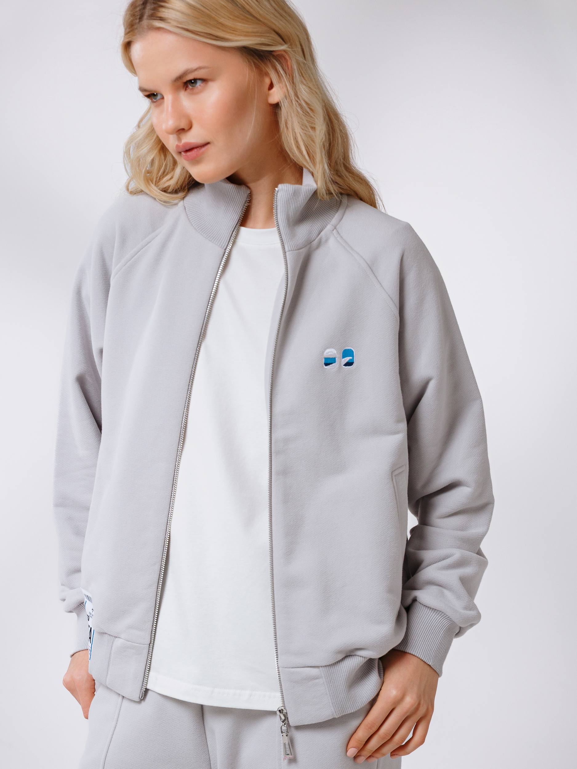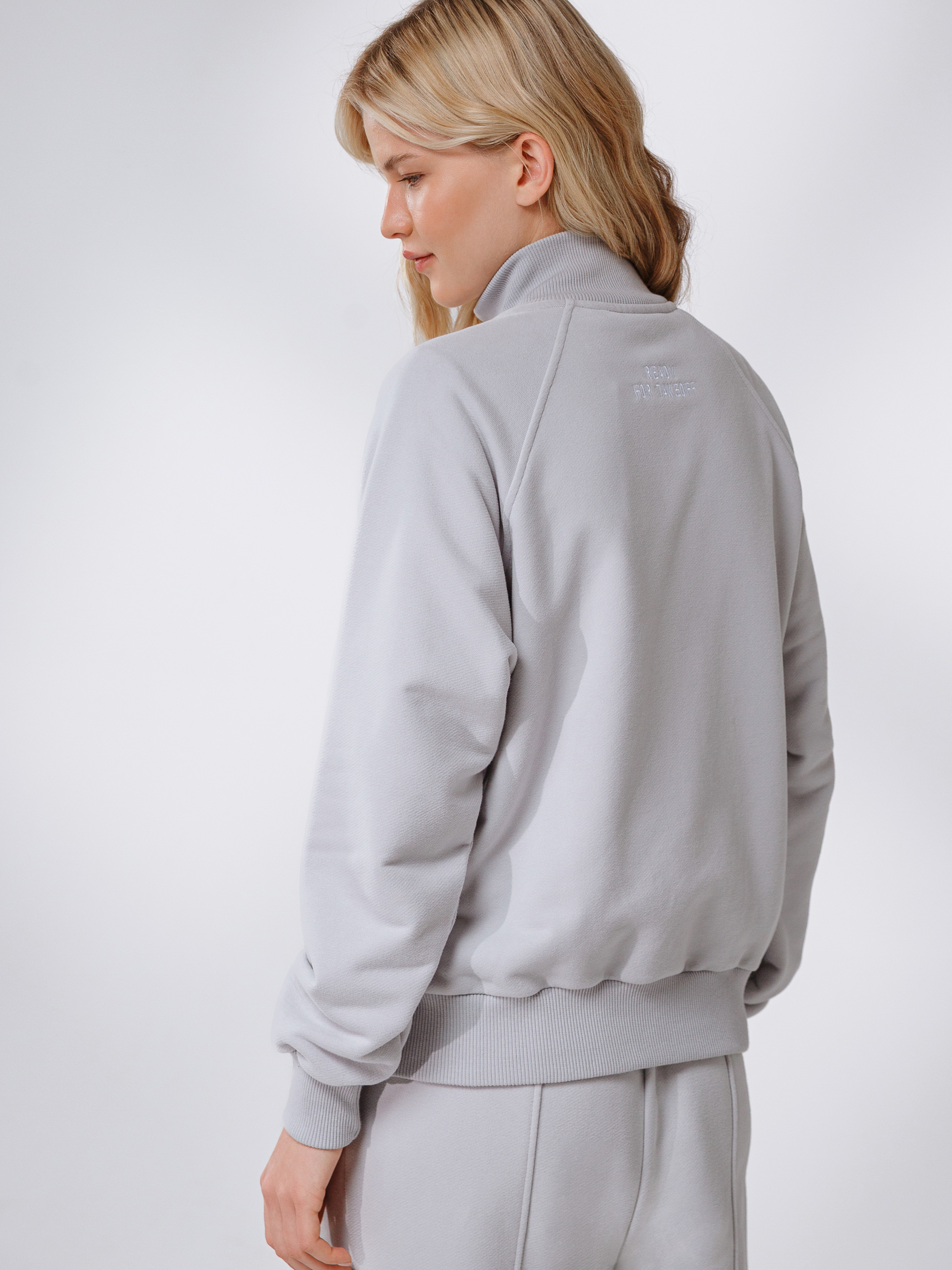 Женская толстовка серого цвета на молнии, выполненная из футера с эффектом велюра. Объёмный крой с рукавом реглан. На груди вышивка в виде иллюминаторов, большой жаккардовый шеврон в виде багажной бирки, а на спинке вышивка с надписью "Ready for takeoff" (Готов к взлёту).