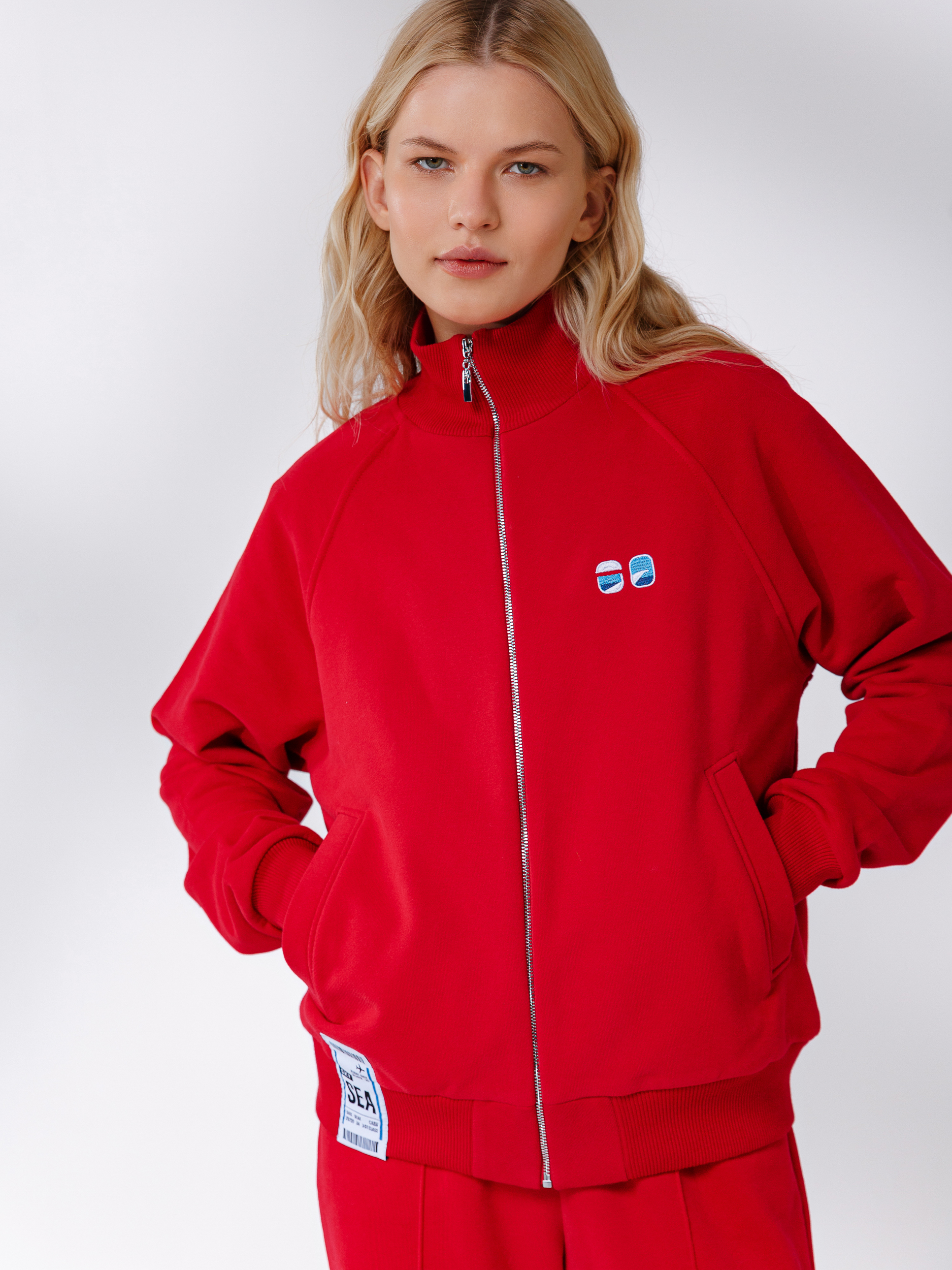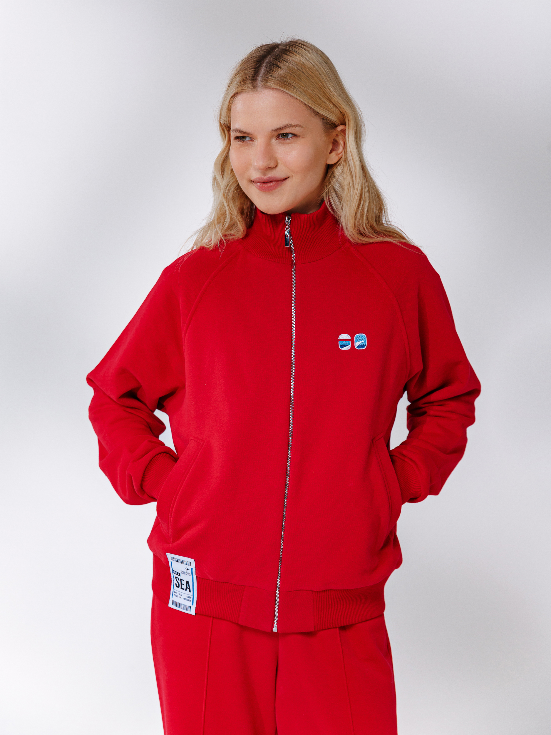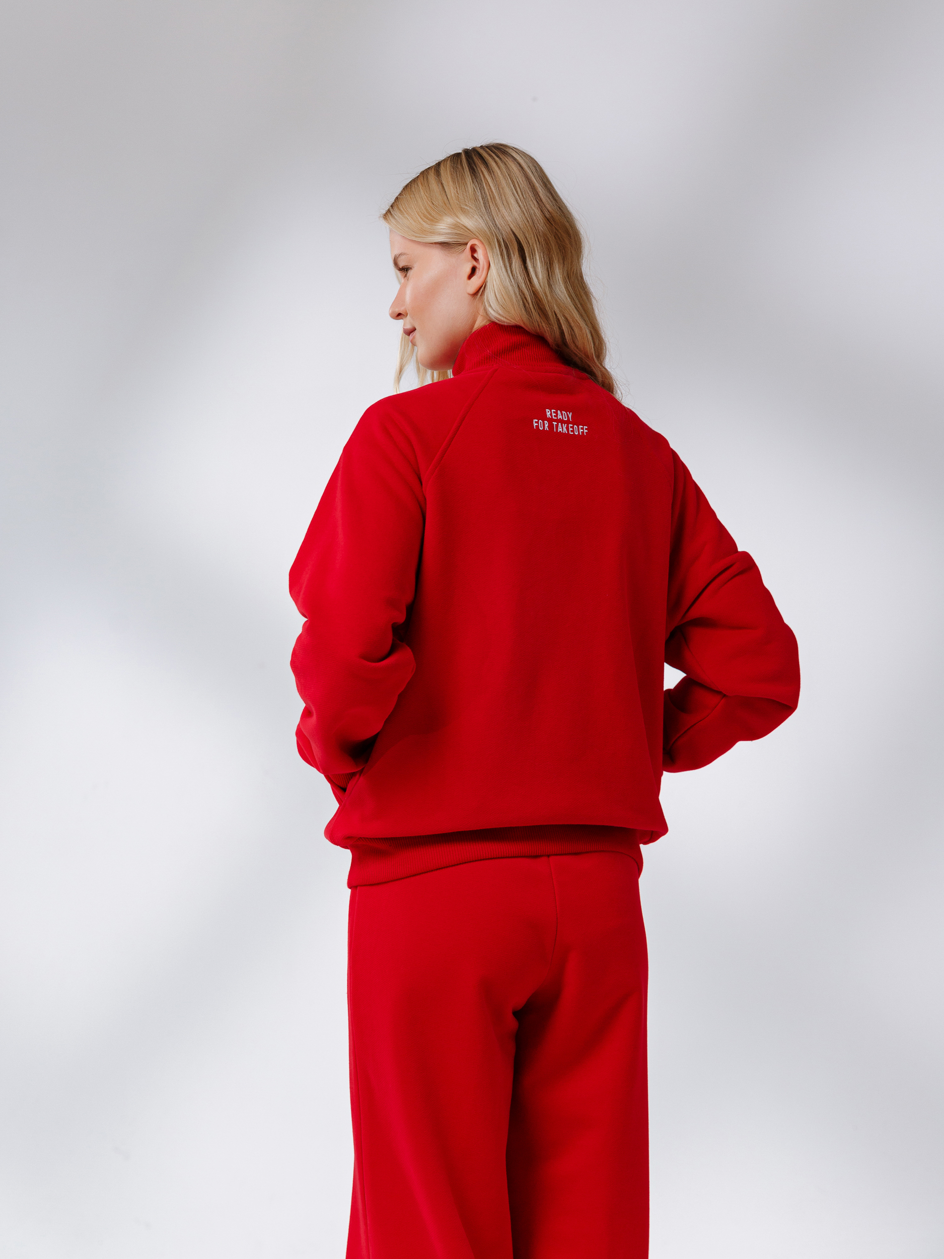 Женская толстовка красного цвета на молнии, выполненная из футера с эффектом велюра. Объёмный крой с рукавом реглан. На груди вышивка в виде иллюминаторов, большой жаккардовый шеврон в виде багажной бирки, а на спинке вышивка с надписью "Ready for takeoff" (Готов к взлёту).